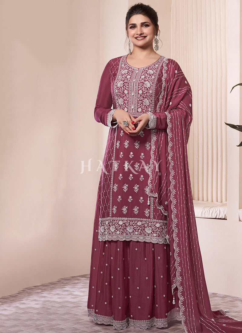 Mauve Sequence And Thread Embroidery Palazzo Suit features indian wear with elegant and stylish look for this festive season. This set is enhanced with traditional reshamkari embroidery done with resham zari thread and sequence work on premium chinnon top paired with heavy ghera embellished chinnon palazzo bottom. The beauty of this set is border and butti work enhanced chinnon dupatta. Wear this with a pair of heels and traditional jewellery for a diva look on this Eid.