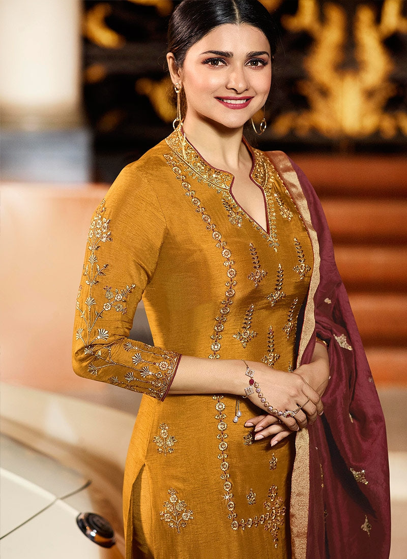 Mustard Yellow And Maroon Pakistani Pant Suit shows combination of embossed zari and thread detailed embroidery on heavy georgette satin top paired with fancy santoon pants bottom and lining and classic digital golden zari embellished silk dupatta. Alluring beauty of this dress will make you look classy and stylish when styled with stilettos and clutch.
