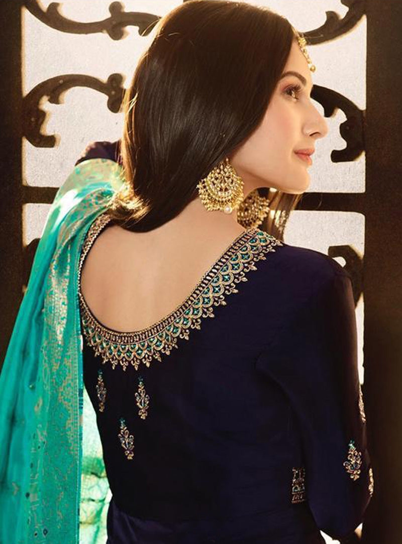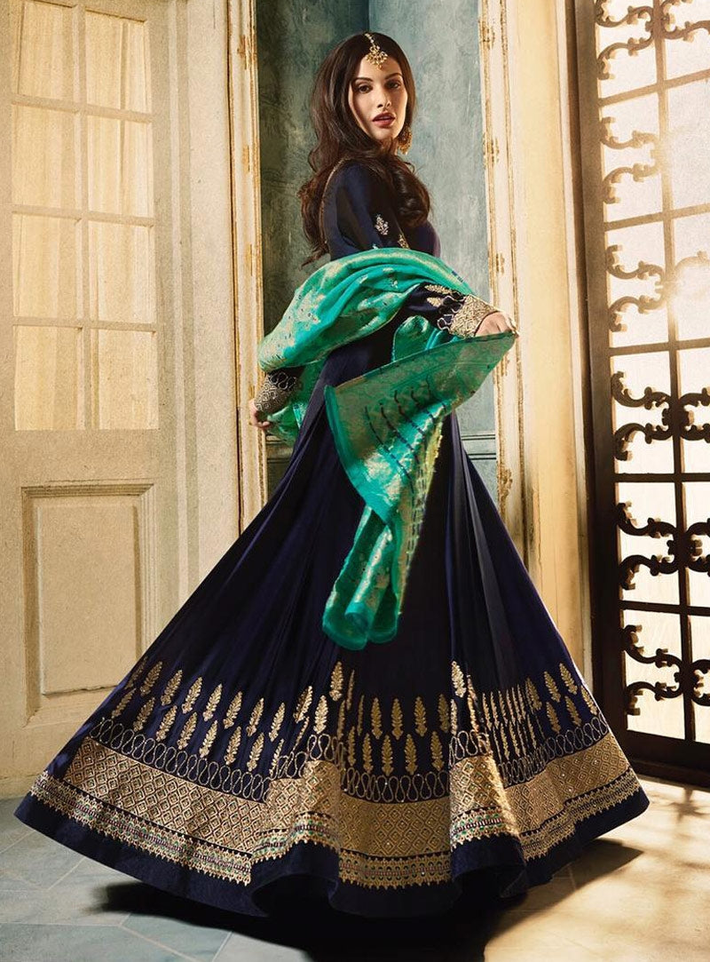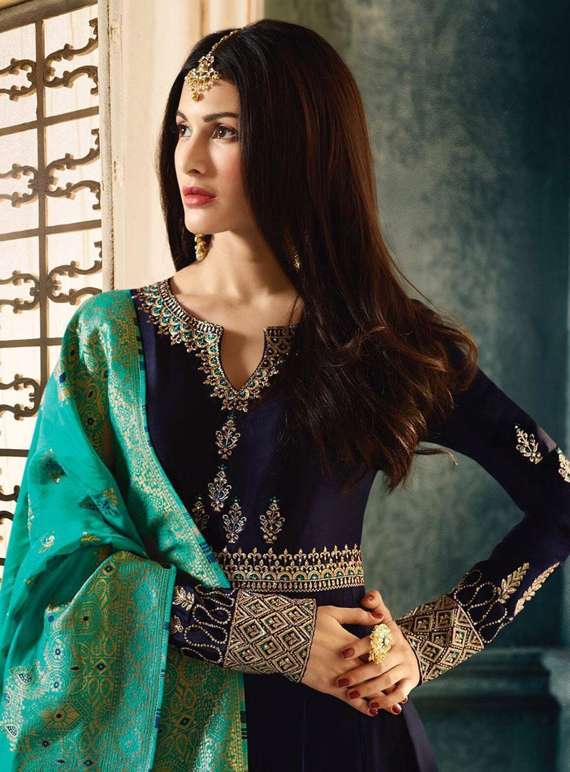 Navy Blue And Turquoise Motif Embroidered Ghera Anarkali Suit is especially crafted for showcasing glamorous style and ethnic elegance with its unique motifs embroidered combination of beautiful zari and thread work annotated perfectly on flared satin georgette anarkali top with border detail. This set accompanies with santoon bottom and digital printed banasi jacquard dupatta. Style it gracefully with studded earrings and stylish heels on this festive season.