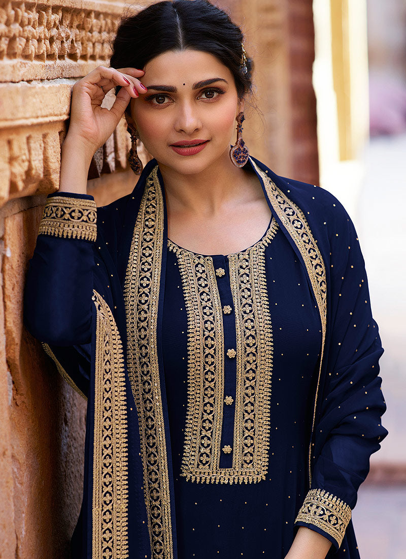 Navy Blue Embroidered Indian Salwar Kameez In usa uk canada Shop Latest Indian Dress Collection Of Navy Blue Embroidered Indian Salwar Kameez Online In Australia, Newzeland. This set has all the ethnic hues of stone, zari and resham thread work done on its pure georgette top paired with solid santoon bottom. The unique part is it’s stone and zari border detailed georgette dupatta. Wear this with a pair of heels and golden jewellery to have a desi girl look.