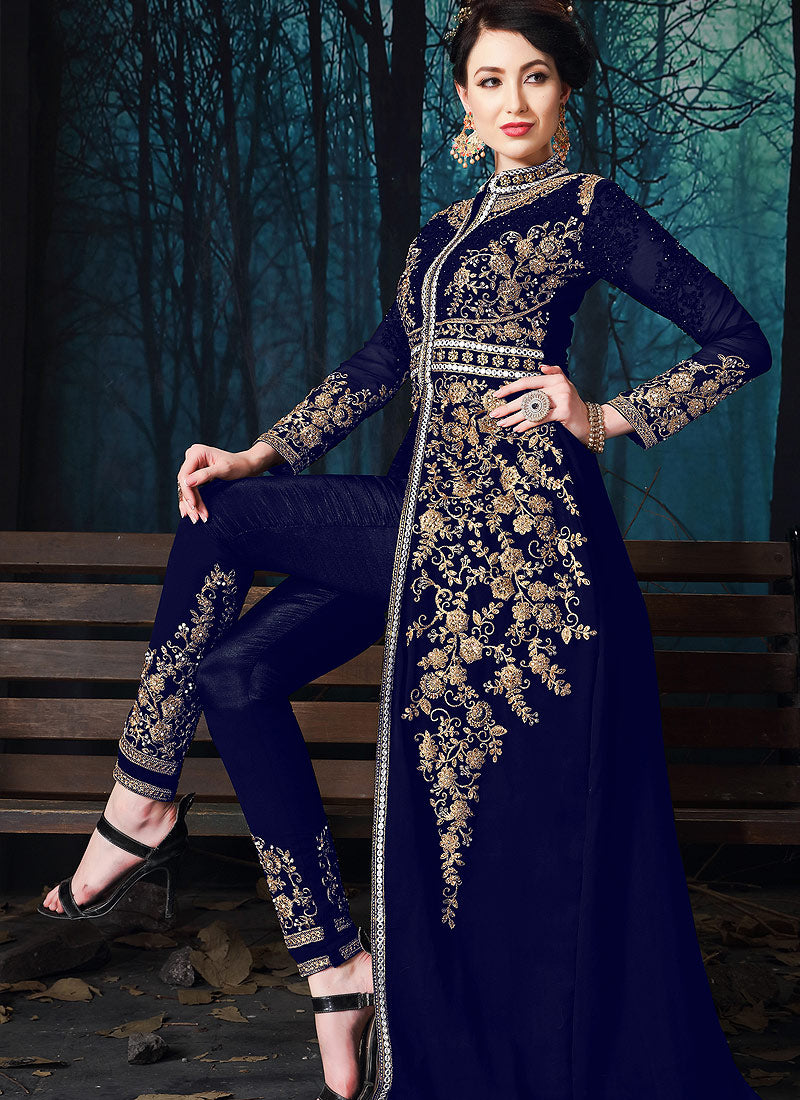 Navy Blue Slit Style Embroidered Anarkali Pant Suit
