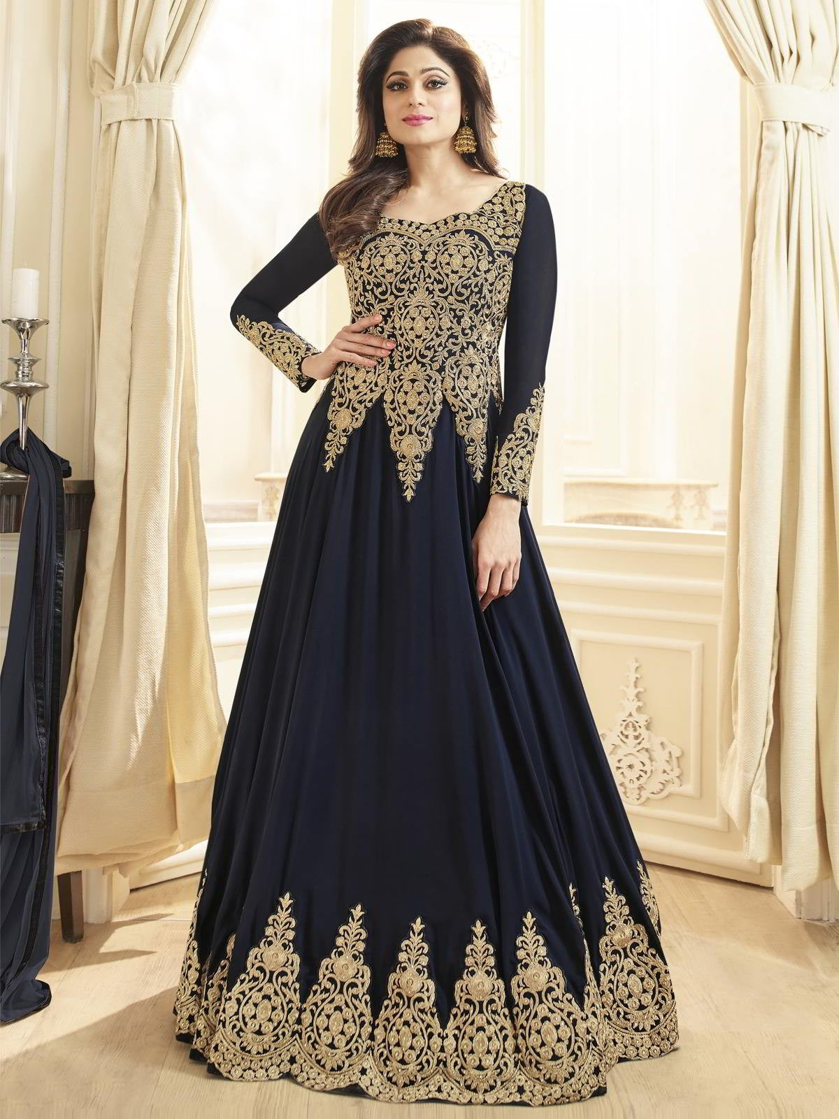 Navy Blue With Golden Detail Flared Anarkali Suit