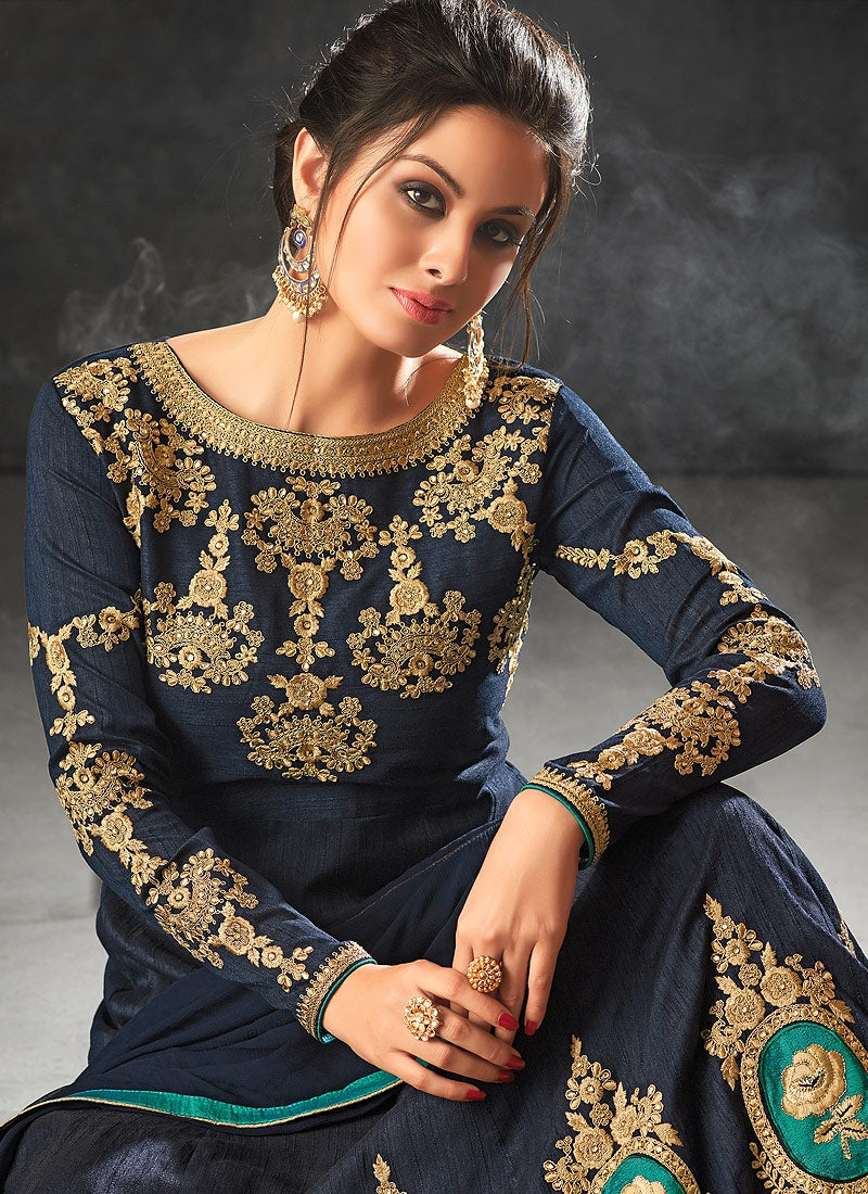 Navy Blue With Minimalist Embroidered Flared Anarkali Suit is specifically designed to make you look perfect for wedding event or any festive occasions. This suit set features floral embroidery work of zari and resham thread embroidered on fancy raw silk top with fussing santoon inner detail paired with santoon bottom and butti detailed chiffon dupatta. Team this suit with stilettos and statement jewellery to complete your look.