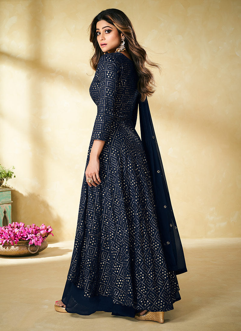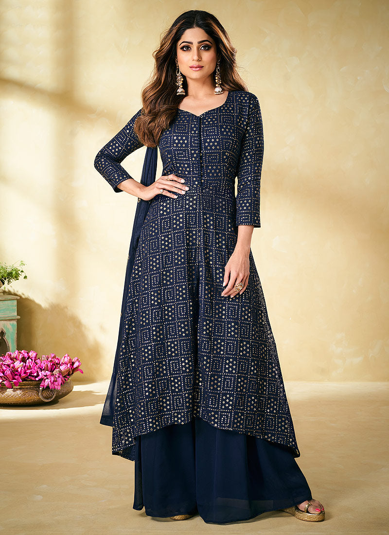 Navy Blue Zari And Badla Embroidered Indian Palazzo Suit is especially crafted to make you look glammed up with its traditional embroidered combination of zari, mirror and badla work annotated perfectly on pure georgette round cut fancy anarkali top paired with georgette flared palazzo bottom and satin silk inner. This set accompanies zari butti enhanced georgette dupatta. Style it gracefully with studded earrings and fancy heels to rock this festival of Eid.