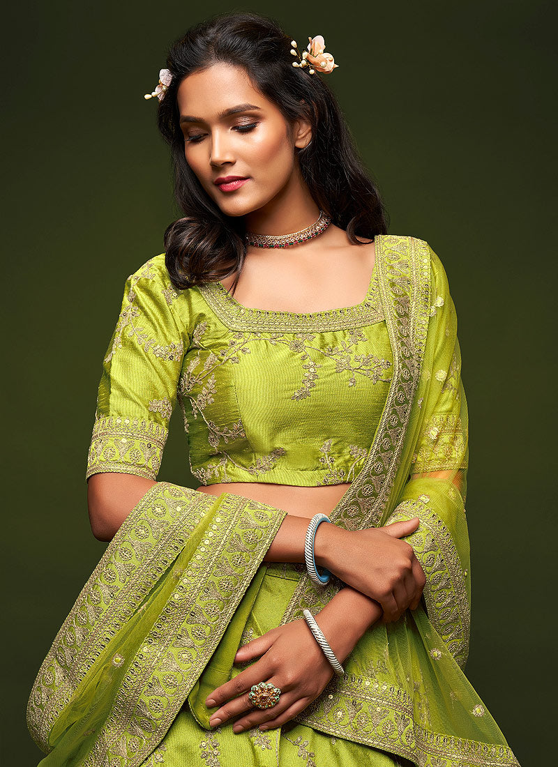 Neon Green Zari Embroidered Silk Lehenga Choli