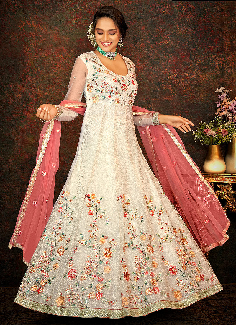 Off White Multi Embroidered Wedding Anarkali Suit Shop Eid Outfits & Dress Free International Shipping. indian wear designed for festival or wedding parties. This outfit features traditional embroidery work on yoke and ghera with zari, thread, sequence and stone on its soft net anarkali top paired with santoon bottom and inner and satin lace and butti detailed net dupatta. This set will surely fetch you compliments for you glamorous sense of style. Team it up with golden jewellery and fancy clutch to look mesmerising on this Eid.