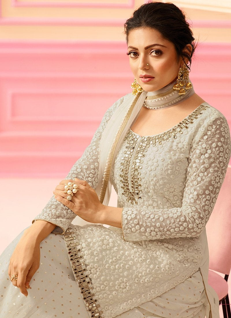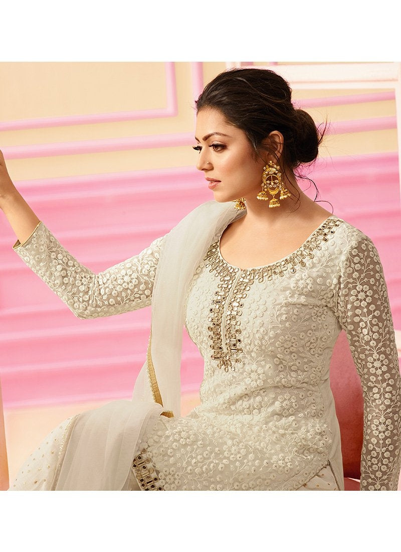 Off White With Golden Embroidered Detail Ethnic Kurti And Palazzo Suit is specially designed to complement your alluring beauty. This suit set comprises a beautiful traditional zari and thread embroidered straight kurti style net with santoon lining top paired with chanderi silk gharara bottom and shimmery net bordered dupatta. This suit set will go well with golden jewellery and heels.