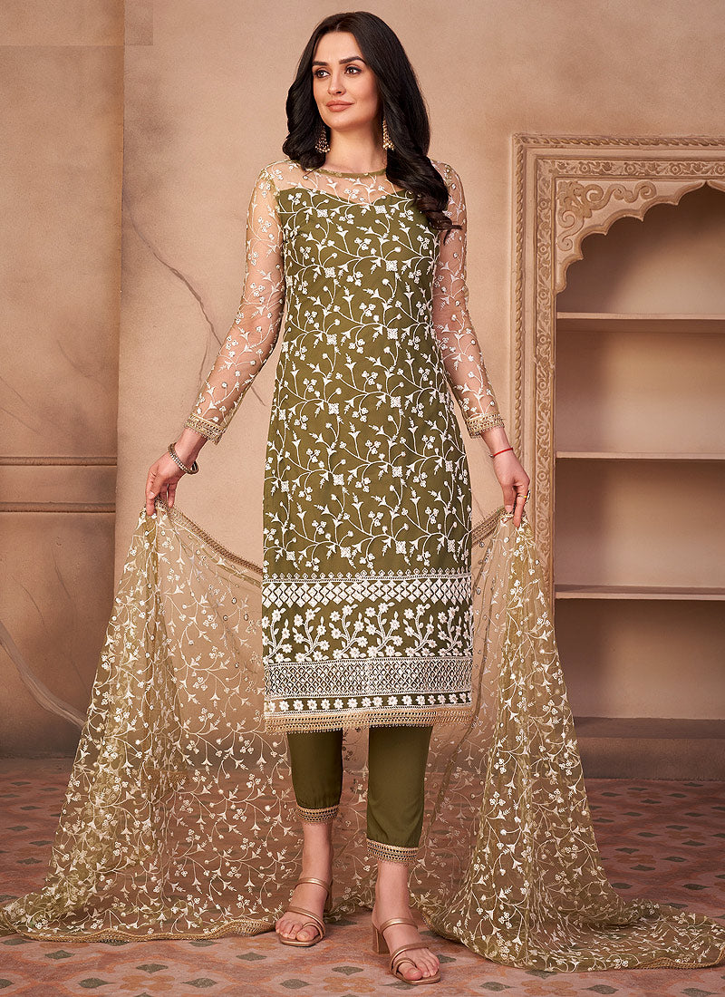 Olive Green Chikankari Pakistani Pant Suit is party wear outfit for upcoming festive and wedding events featuring chikankari embroidery resham thread, zari and sequence work detail on mono net straight cut top paired with embellished fancy american crape bottom and inner. The unique part is it’s minimalist satin lace bordered and embroidered soft net dupatta. Wear this with a pair of heels and golden jewellery to have a desi girl look on this Eid.