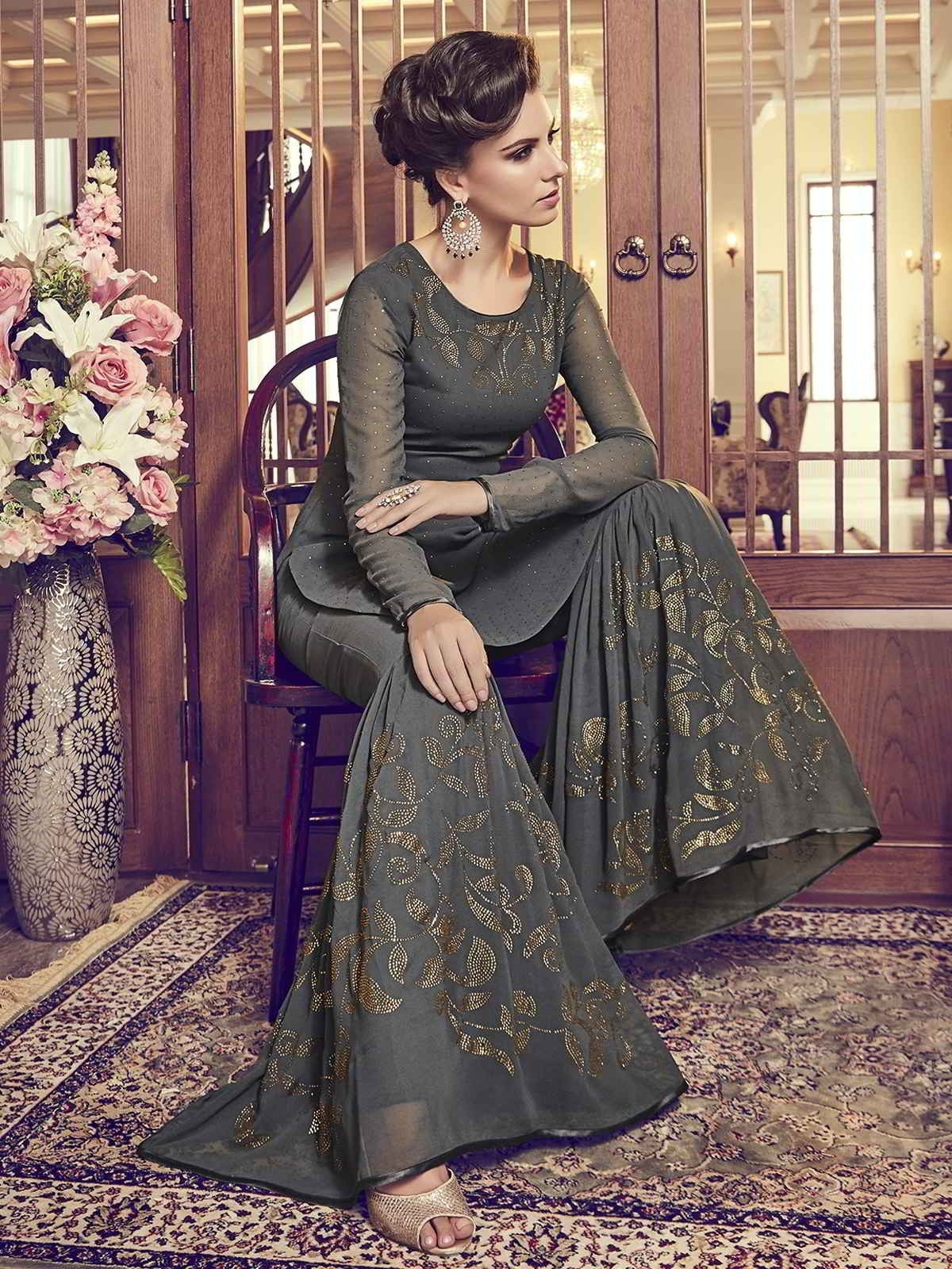 Olive Green Embellished Classic Palazzo Suit features very intrinsic designer embroidery with stone detail over its georgette top paired with matching ghera embroidered georgette palazzo bottom and embellished georgette dupatta. The dress accompanies with matching heavy satin lining for top and bottom. Wear this to bright up your wedding parties or any social event with heels and jewellery to look best from rest of the crowd.