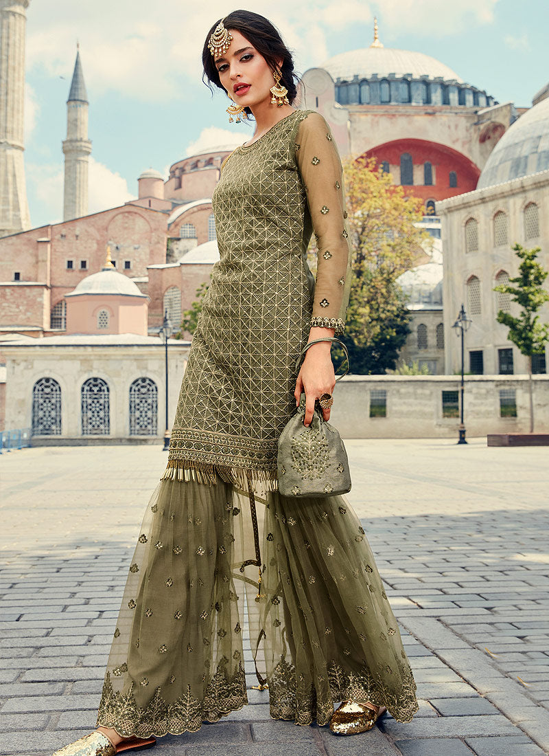 Olive Green Designer Gharara Suit In usa uk canada. Shop Latest Indian Clothes Collection Of Olive Green Designer Gharara Suit Online In Australia, Newzeland. This suit set comprises a beautiful traditional zari, sequence and thread embroidered straight cut net with santoon lining top paired with net embellished gharara bottom and shimmering lace bordered net dupatta. This suit set will go well with golden jewellery and heels.