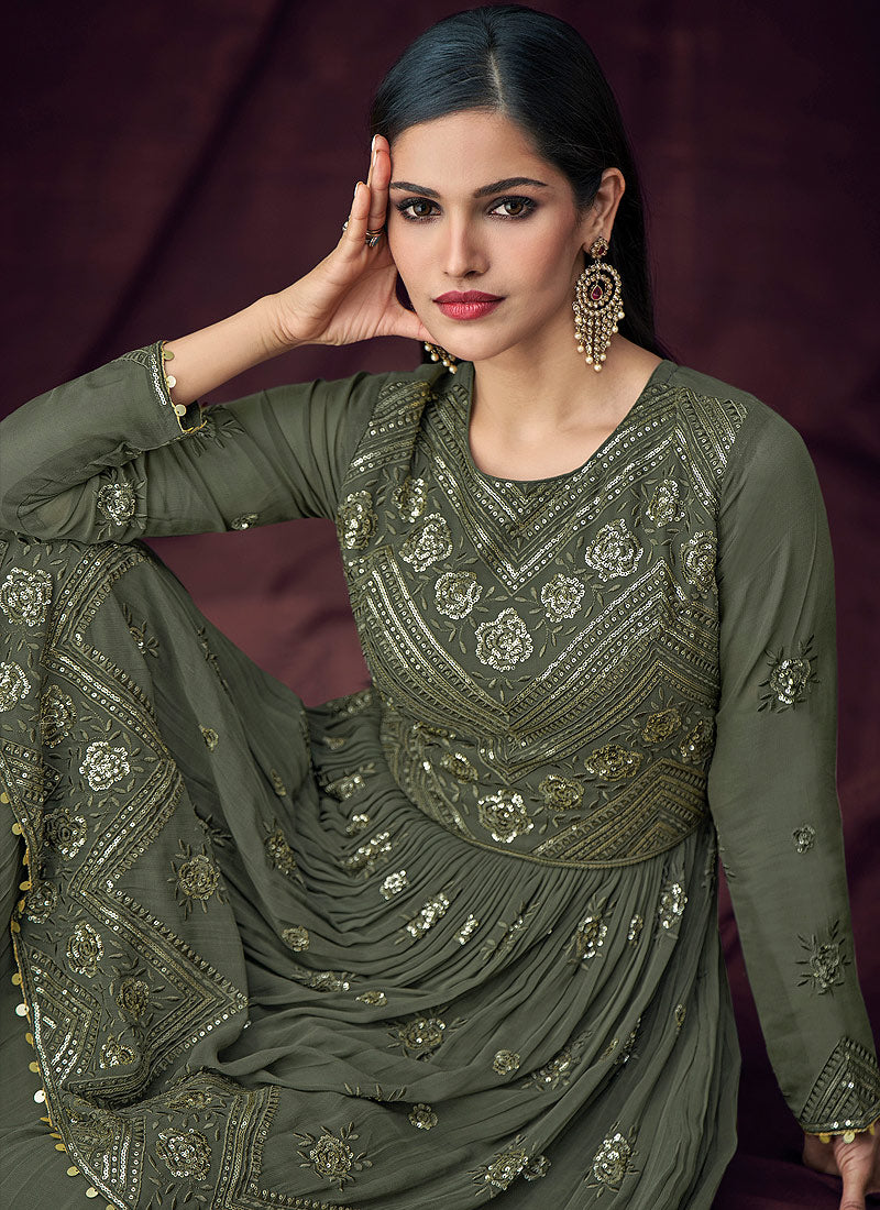 Olive Green Embroidered Peplum Style Anarkali Lehenga Suit Shop Latest Indian Clothes For Eid 2022 Free International Shipping features indian dress with traditional jacquard motif embroidery detail annotated beautifully with the combination of golden zari, resham and sequence work on georgette jacket with cropped embellished inner paired with georgette kalidar lehenga bottom and georgette dupatta. Style this very pretty attire on any wedding or festival party with heels and golden jewellery to look stunningly beautiful from the rest of the crowd.