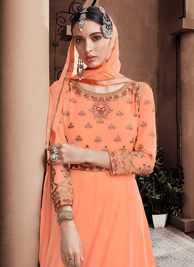 Orange Bliss Multi Embroidered Flared Anarkali Suit is specifically designed to make you look perfect for wedding event or any festive occasions. This suit set features traditional floral butti work of zari and resham thread embroidered on fancy georgette top with santoon inner paired with dull santoon bottom and bordered chiffon dupatta. Team this suit with stilettos and statement jewellery to complete your look.