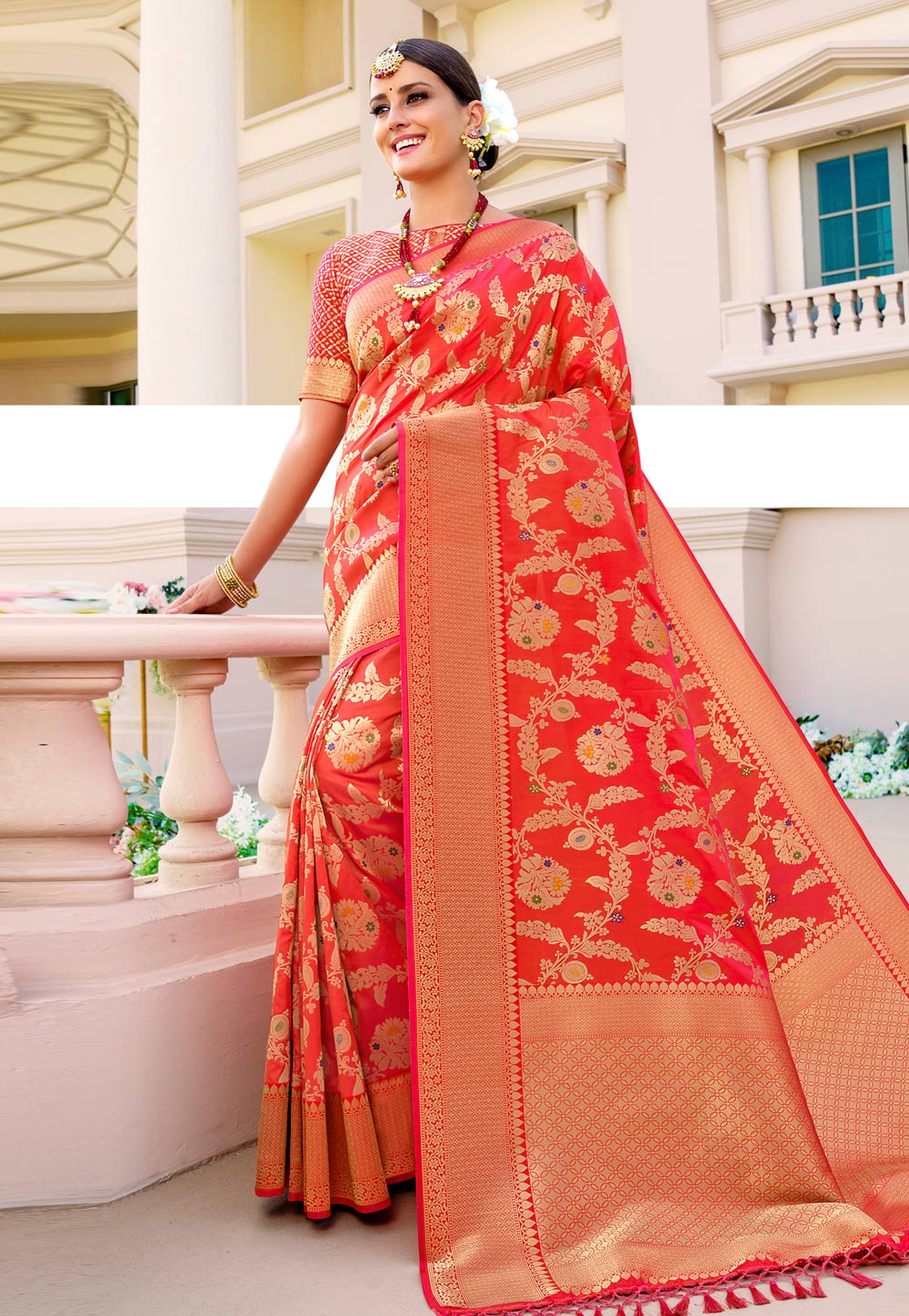 Orange Indian Banarasi Silk Saree In usa uk canada Shop Latest Indian Saree Collection Of Orange Indian Banarasi Silk Saree Online In Australia, Newzeland indian wear with elegance and vibrant appealing with all the hues of zari brocade work that has traditional floral touch embedded perfectly with tassels details over pallu on banarasi silk with matching equally embellished raw silk blouse. Drape this saree on fesitive parties or on wedding event with heels and statement jewellery to look like a diva.
