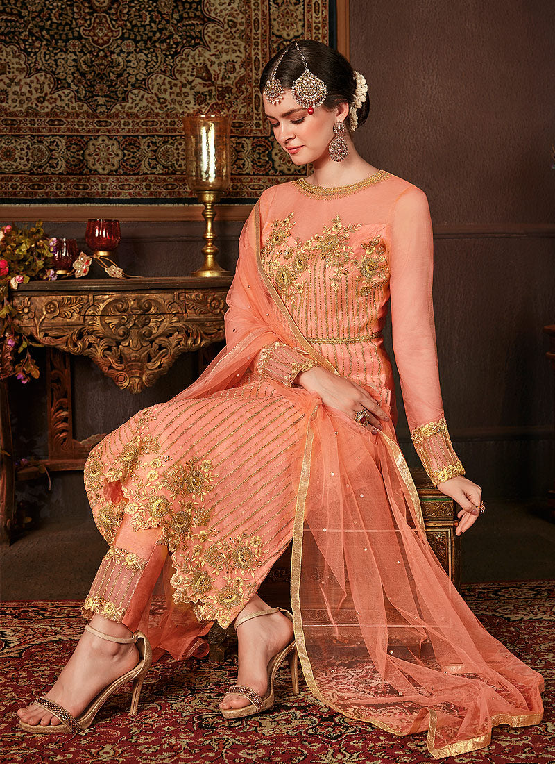 Pastel Orange Embroidered Pakistani Pants Suit is pakistani style suit with elegant and stylish look to style on wedding events. This set has all the traditional hues of zari, tread and multi embroidery karigiri on its soft net top paired with banarasi silk embroidered pants bottom and inner. The unique part is it’s exclusive satin bordered net dupatta. Wear this with a pair of heels and golden jewellery to have a desi girl look.