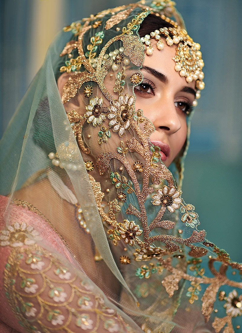 Peach And Blue Embroidered Kaliyaari Lehenga Choli Set
