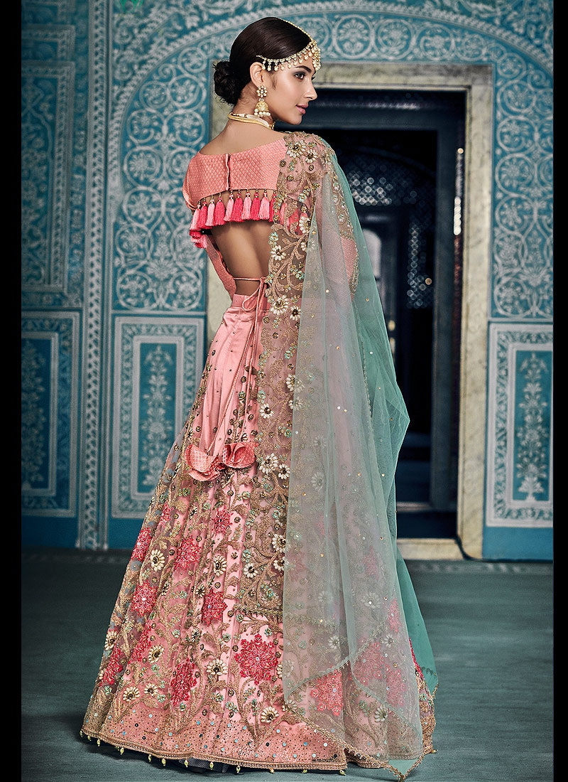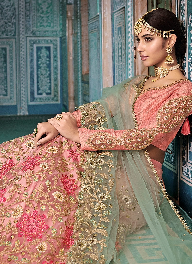 Peach And Blue Embroidered Kaliyaari Lehenga Choli Set is feminine, appealing and excellent pick for this wedding season . This elegant set has a very pretty zari embroidery and thread work detail on flared silk lehenga paired with equally embellished matching silk and satin choli and fascinating multi embroidered net dupatta. Team this beautiful attire with classic pair of heels and matching jewellery to look like a diva.