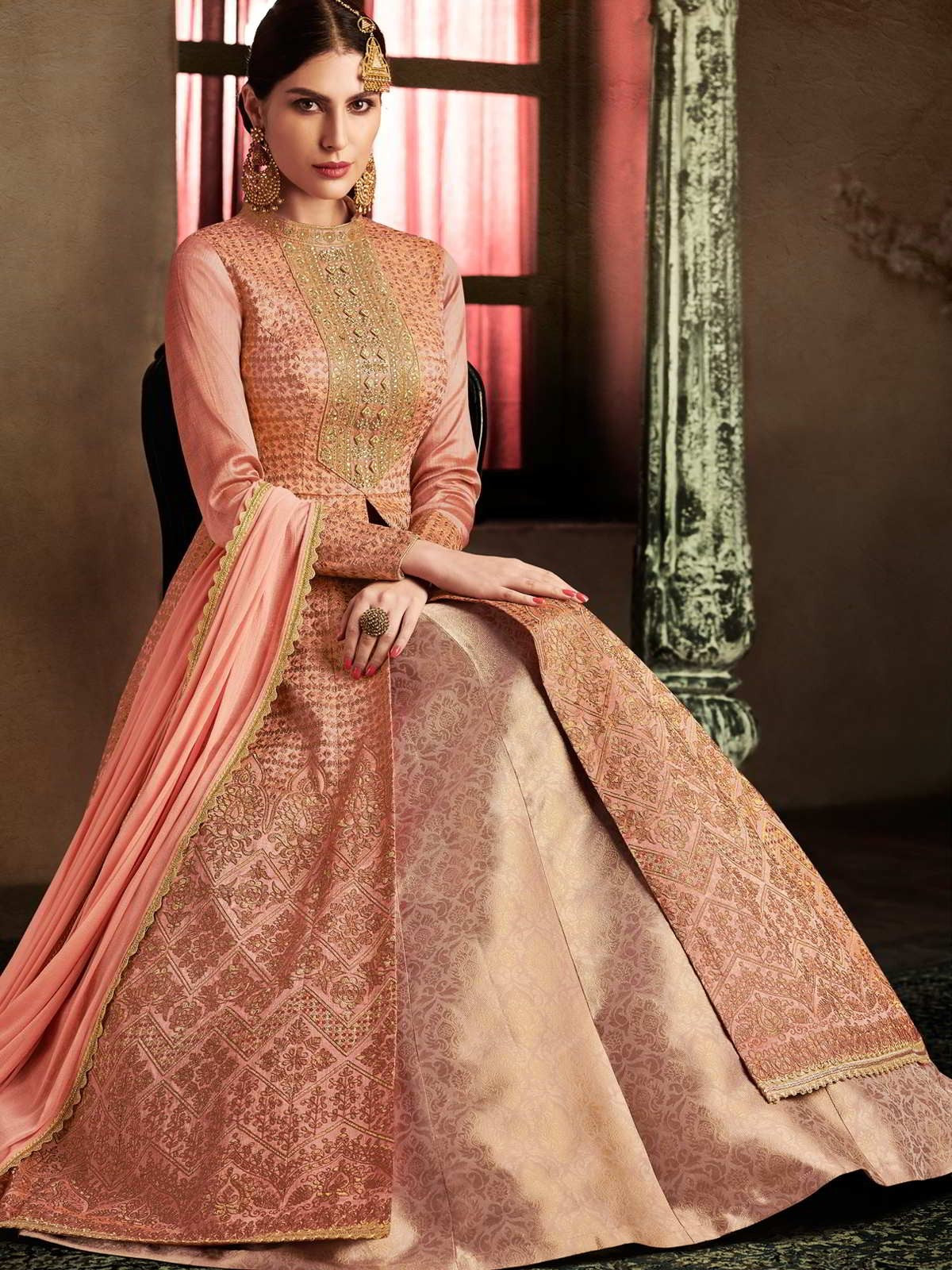Peach And Gold Embroidered Anarkali Lehenga Style Suit In usa uk canada Shop Latest Indian Anarkali Suit Collection Of Peach And Gold Embroidered Anarkali Lehenga Style Suit Online In Australia, Newzeland. This set features embossed embroidery work with thread and stone work detail on its Silk anarkali top paired with santoon Lehenga bottom and lining. This designer set has minimalist butti embroidered real georgette dupatta. Team it up with golden jewellery and fancy clutch to look mesmerising.