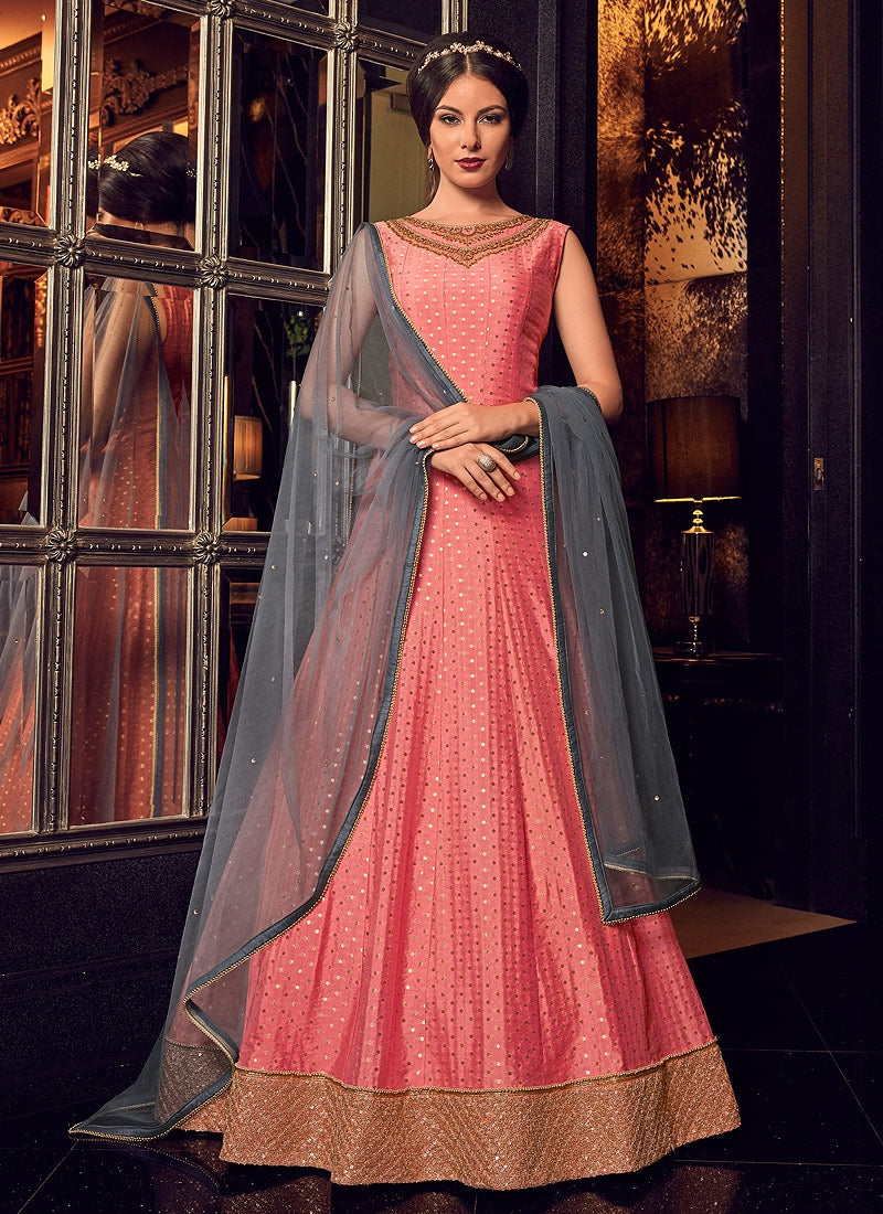 Peach And Grey Minimalist Embroidered Jacket Style Anarkali Suit is specifically designed to make you look perfect as a bride and bridesmaids. This suit set features thread and resham kali embroidered detail on fancy net over layered on chanderi jacquard gown paired with shimmering embellished net dupatta. Team this suit with stilettos and statement jewellery to complete your look.