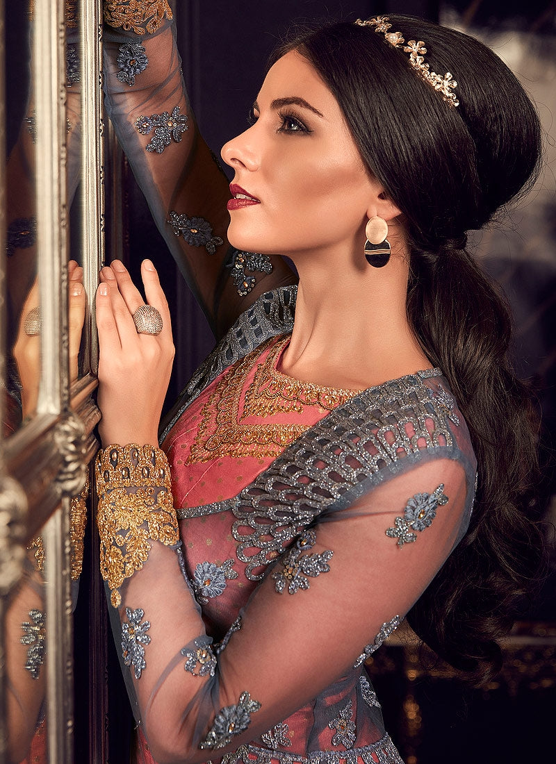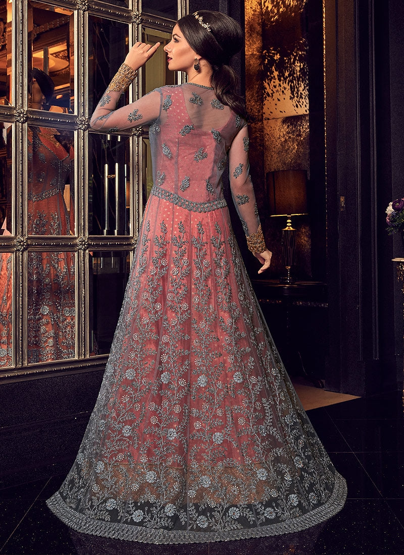 Peach And Grey Minimalist Embroidered Jacket Style Anarkali Suit