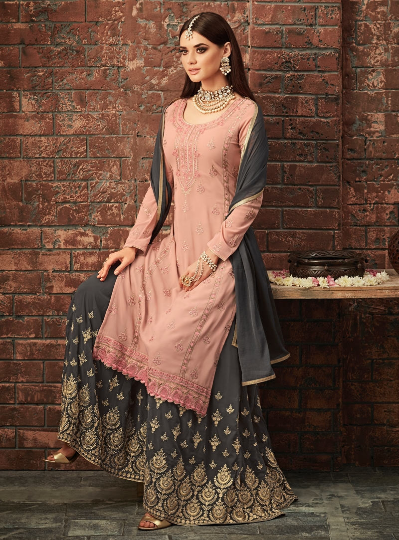Peach And Grey Traditional Embroidered Palazzo Suit
