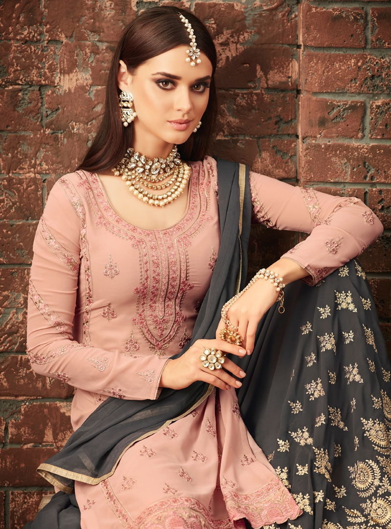 Peach And Grey Traditional Embroidered Palazzo Suit is feminine, appealing and excellent pick for any festival and on wedding function. This elegant set comprises a georgette with santoon lining kurta with all over embroidery detailed with minimal motifs of zari, thread and sequence work, a pair of georgette embellished palazzo bottom and chiffon bordered dupatta. Team this suit with beige heels and matching accessories to have a graceful look.