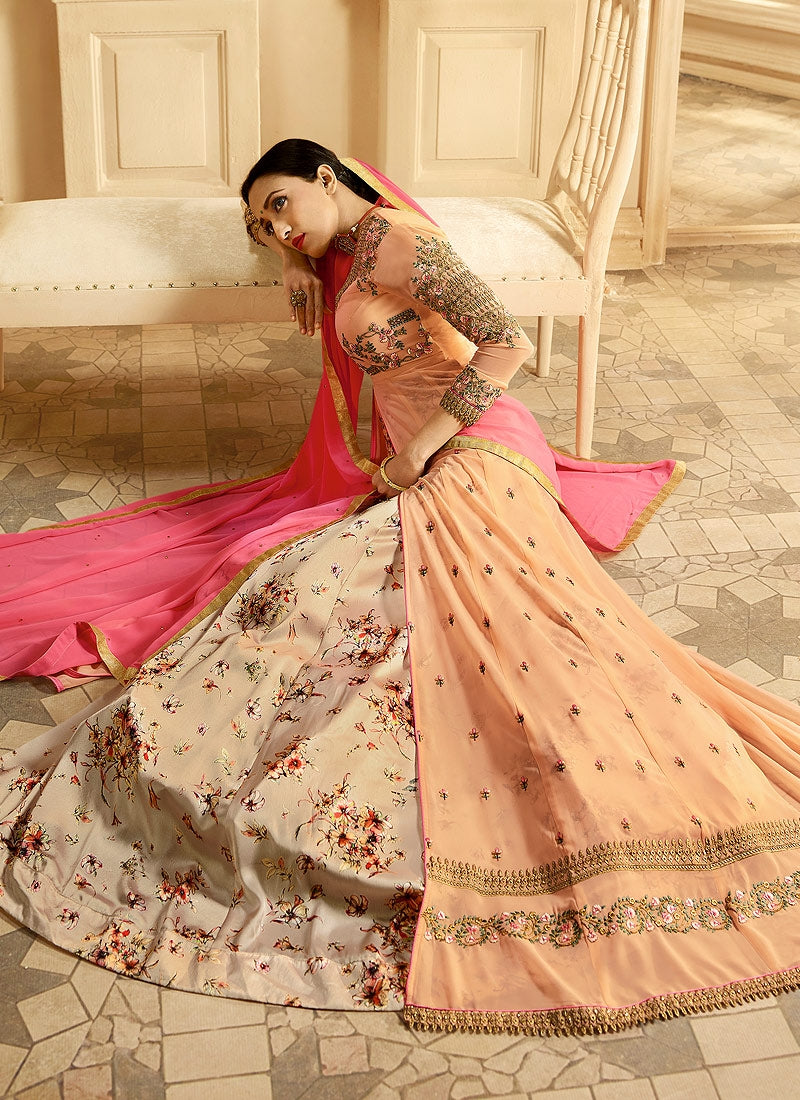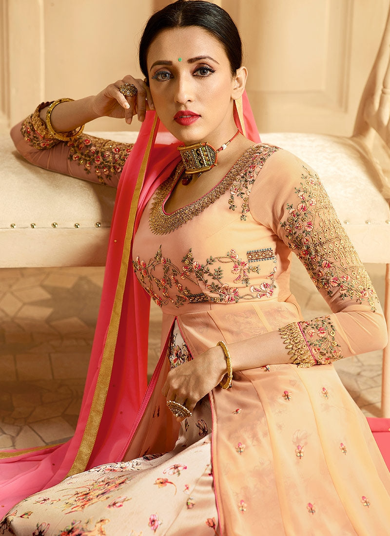 Peach And Pink Printed Slit Style Embroidered Anarkali Suit