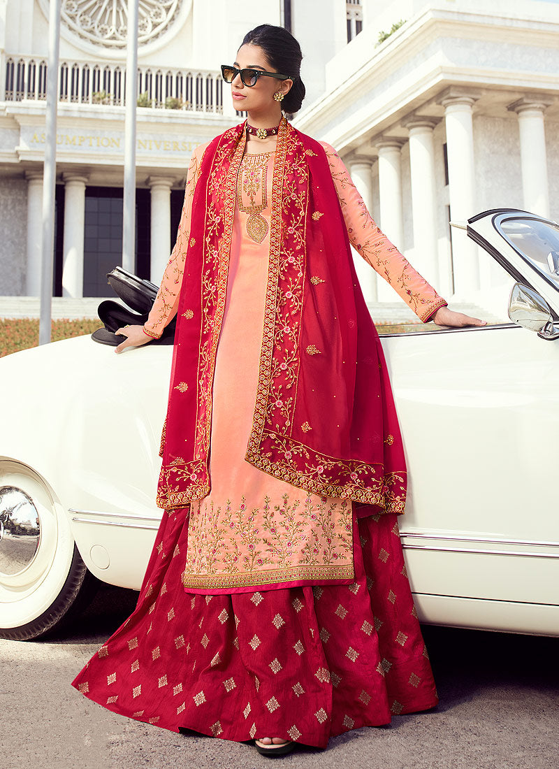 Peach And Red Embroidered Lehenga Style Suit