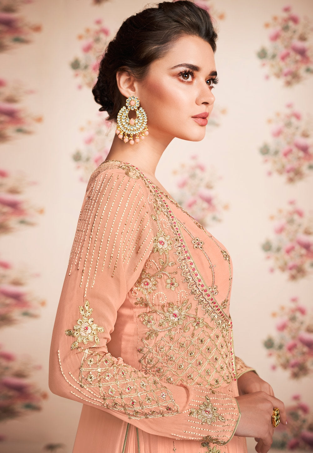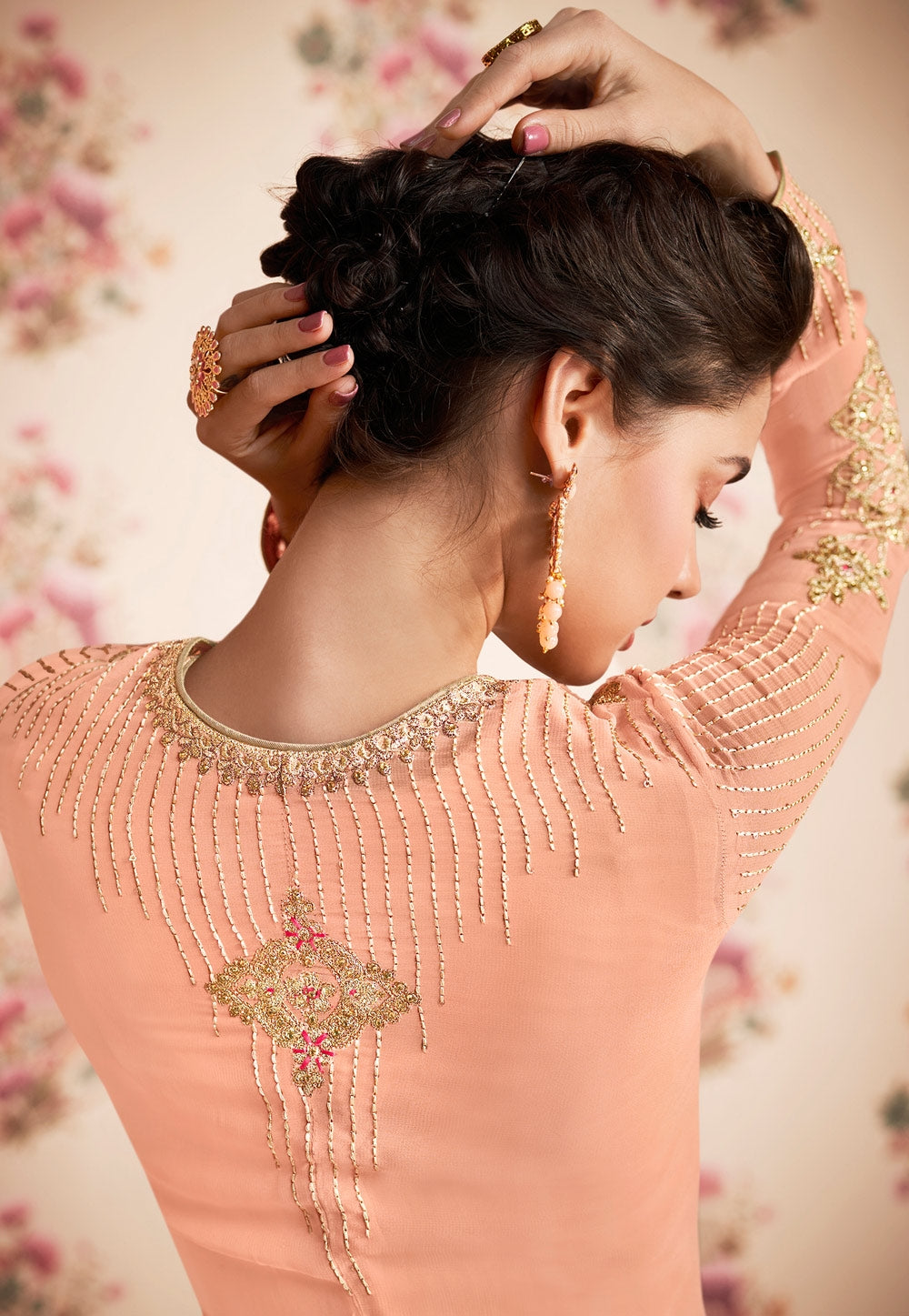 Peach Embroidered Jacket Anarkali Suit is feminine and appealing and excellent pick for any special occasion. This elegant set comprises georgette embroidered overcoat style gown with neck, sleeves and daman detailed with minimal motifs of zari and thread embroidery paired with santoon bottom and chiffon bordered dupatta. Team this suit with golden heels and matching accessories to have a graceful look.