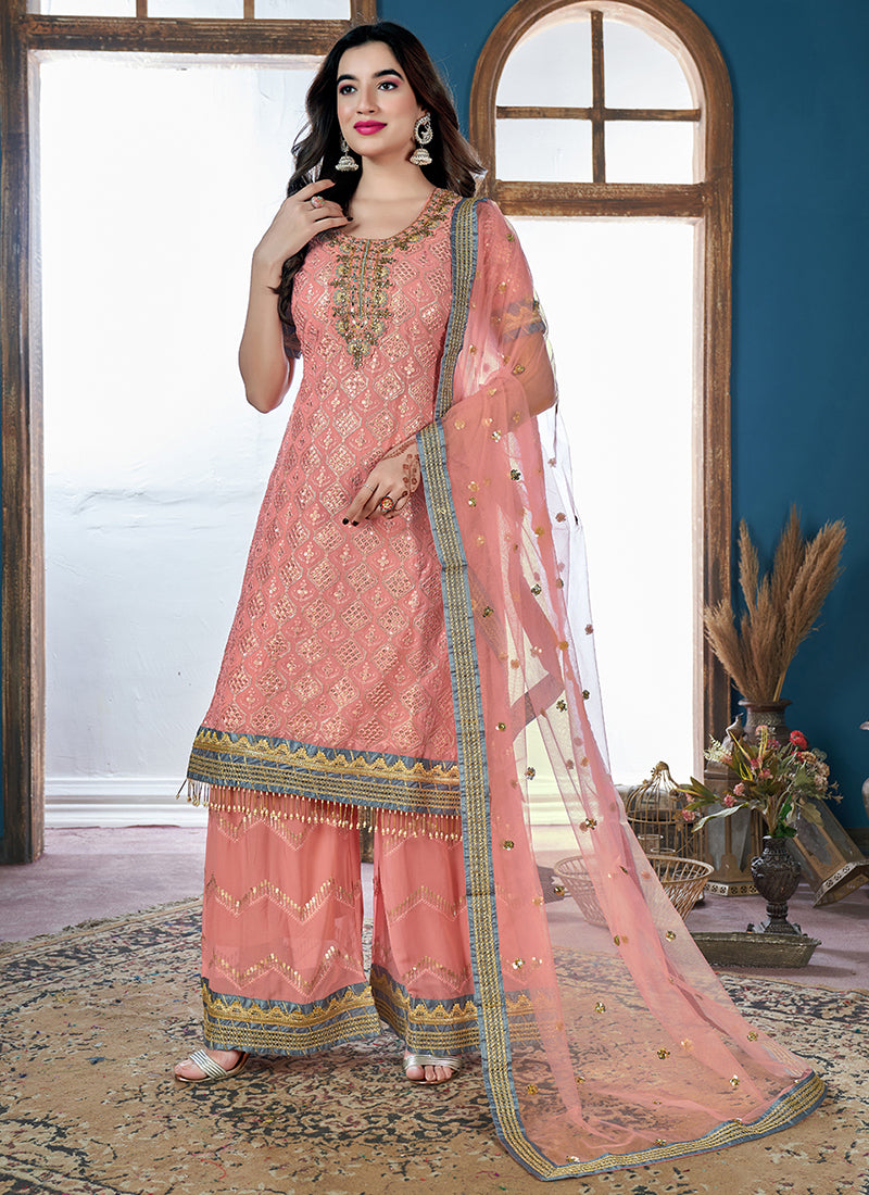 Peach Golden Sequence Embroidery Traditional Palazzo Suit