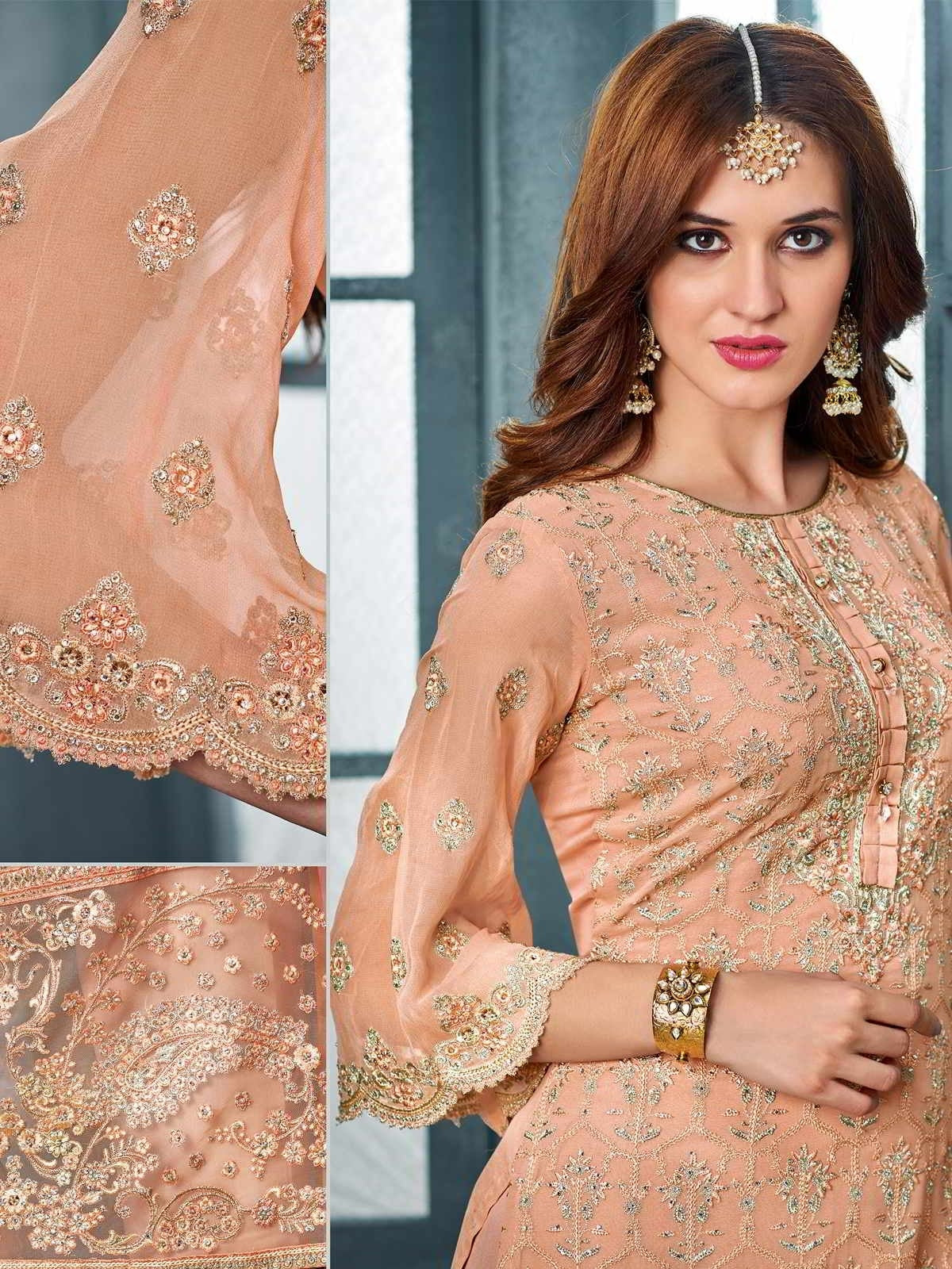 Peach Overall Designer Embroidered Pant Suit is feminine and appealing and excellent pick for any special occasion. This elegant set comprises a pure georgette with santoon lining kurta with neckline, sleeves and daman detailed with minimal traditional motifs of thread and zari embroidery, a pair of santoon embroidered pants bottom and nazmine chiffon bordered dupatta. Team this suit with beige heels and matching accessories to have a graceful look.