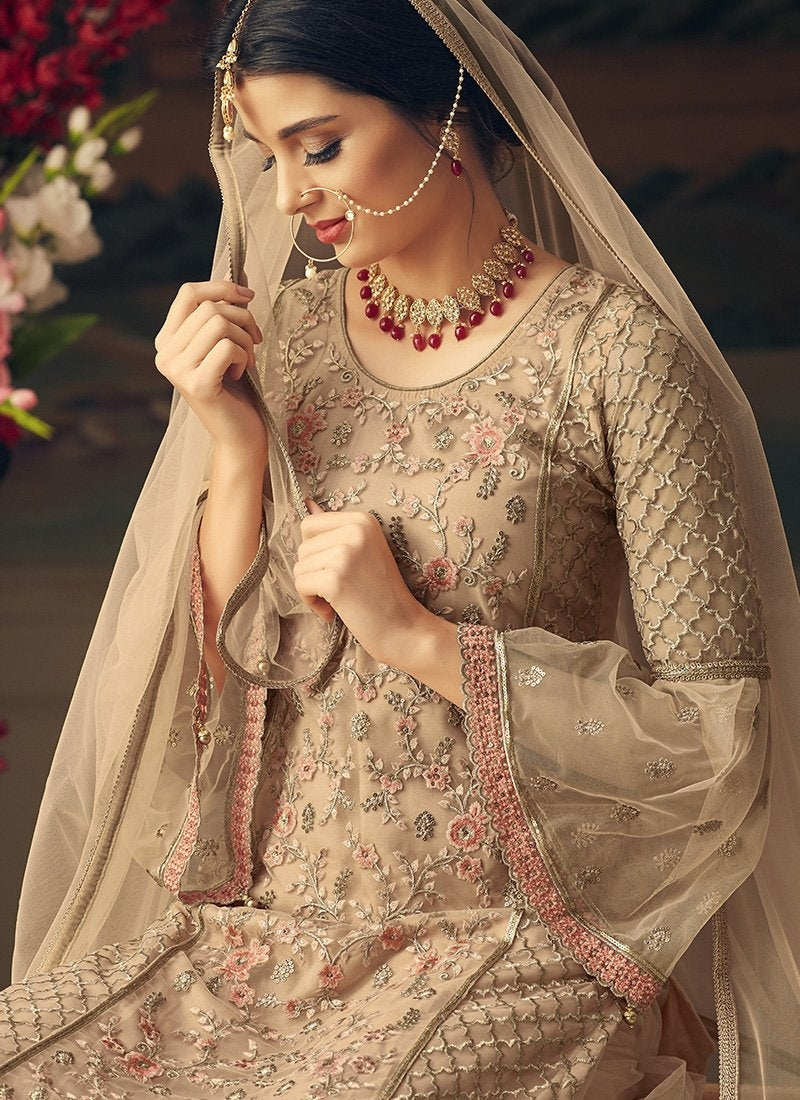Peach Overall With Multi Embroidery Flared Sharara Suit is feminine, appealing and excellent pick for this diwali festival and on wedding function. This elegant set comprises a net with santoon lining kurta with all over embroidery detailed with minimal motifs of zari, thread and sequence work, a pair of net embellished sharara bottom and net bordered dupatta. Team this suit with beige heels and matching accessories to have a graceful look.