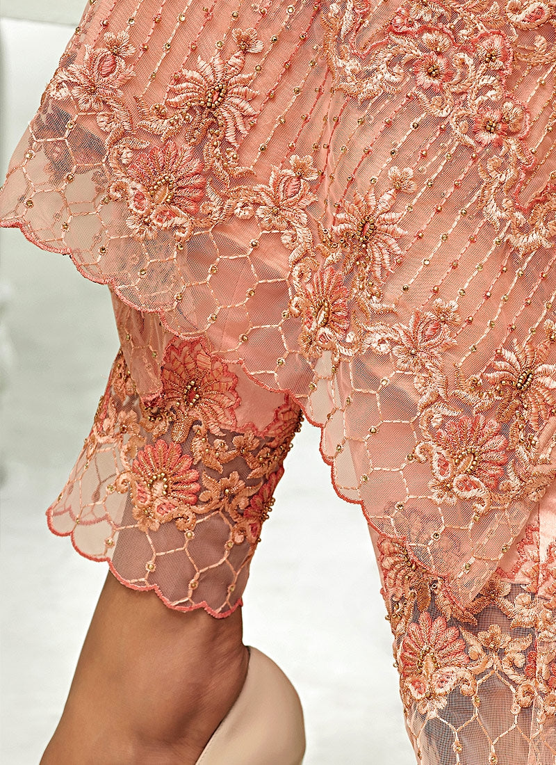 Peach Pakistani Embroidered Pant Suit is feminine and appealing and excellent pick for any special occasion. This elegant set comprises a fancy net and santoon lining top with neckline, sleeves and daman detailed with minimal floral motifs highlighted with stone and pearl handwork, a pair of pakistani style pants bottom and net satin bordered dupatta. Team this suit with fancy heels and matching accessories to have a graceful look.