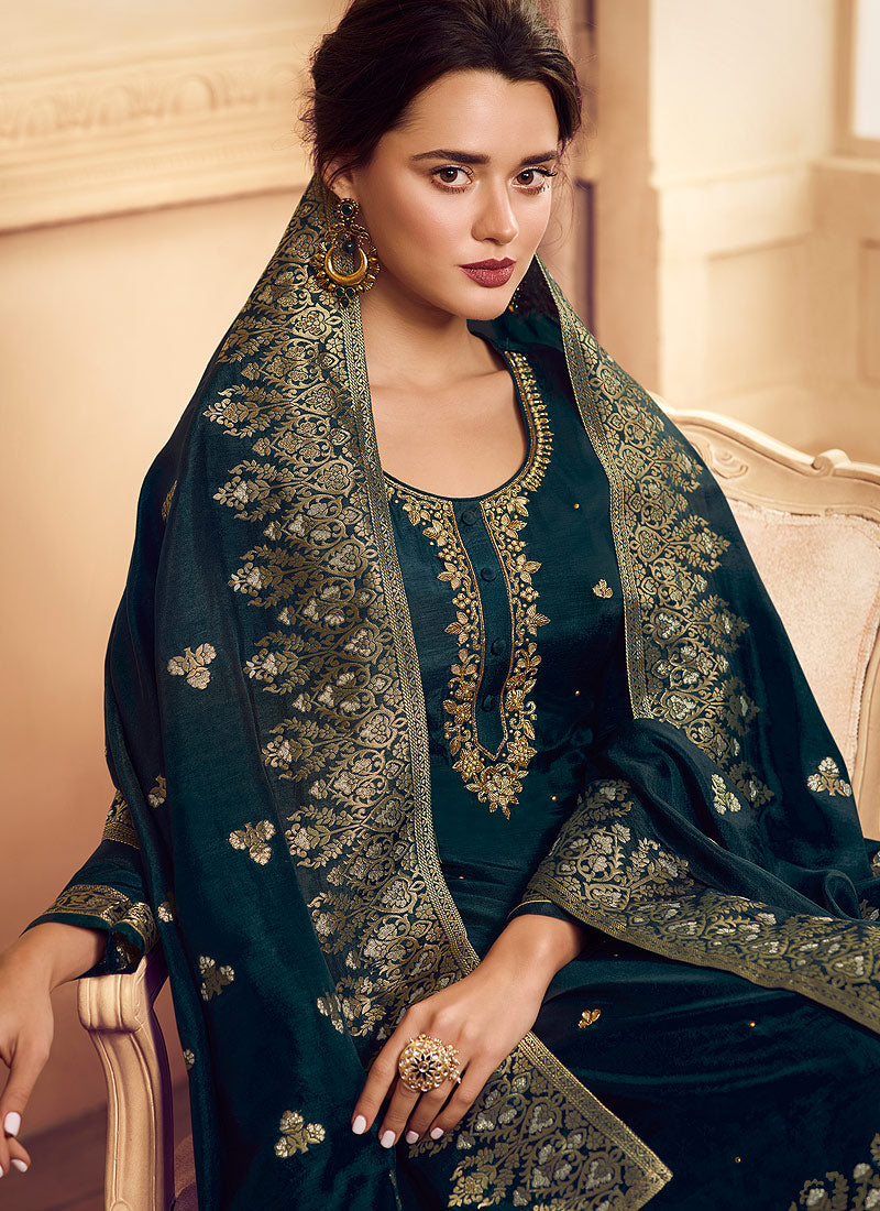 Peacock Blue Golden Embroidered Designer Palazzo Suit festures palazzos pant suit with elegant and stylish look for indian weddings. This set has all the traditional hues of zari work on its viscose jacquard top paired with equally embellished viscose santoon bottom. The unique part is it’s golden zari embellished bordered jacquard silk dupatta. Wear this with a pair of heels and golden jewellery to have a desi girl look.