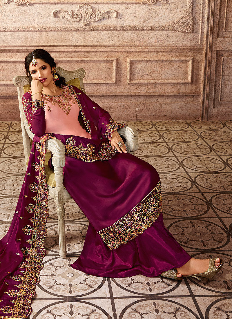 Pink And Purple Shaded Embroidered Palazzo Suit festures palazzos pant suit with elegant and stylish look for indian weddings. This set has all the traditional hues of stone, zari and thread work done on its satin georgette top paired with santoon bottom and inner. The unique part is it’s zari embellished crape dupatta. Wear this with a pair of heels and golden jewellery to have a desi girl look.