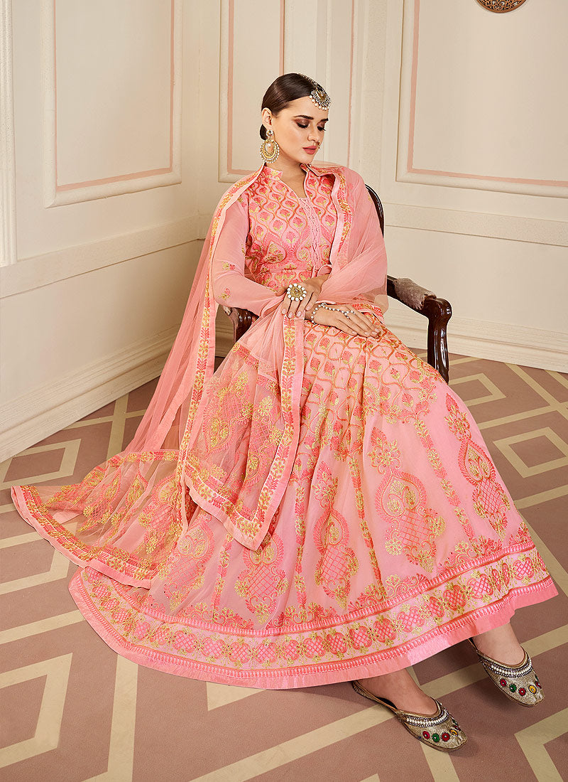 Pink Lucknowi Anarkali Suit In usa uk canada. Shop Latest Indian Clothes Collection Of Pink Lucknowi Anarkali Suit Online In Australia, Newzeland. This elegant set is curated with designer zari, thread and stone embroidery in lucknowi style on faux georgette round cut anarkali top with traditional motifs paired with solid santoon pants bottom and lining. The beauty part of this suit is exclusively embroidered detailed net dupatta. Team this suit with basic heels and matching accessories to have a graceful look.