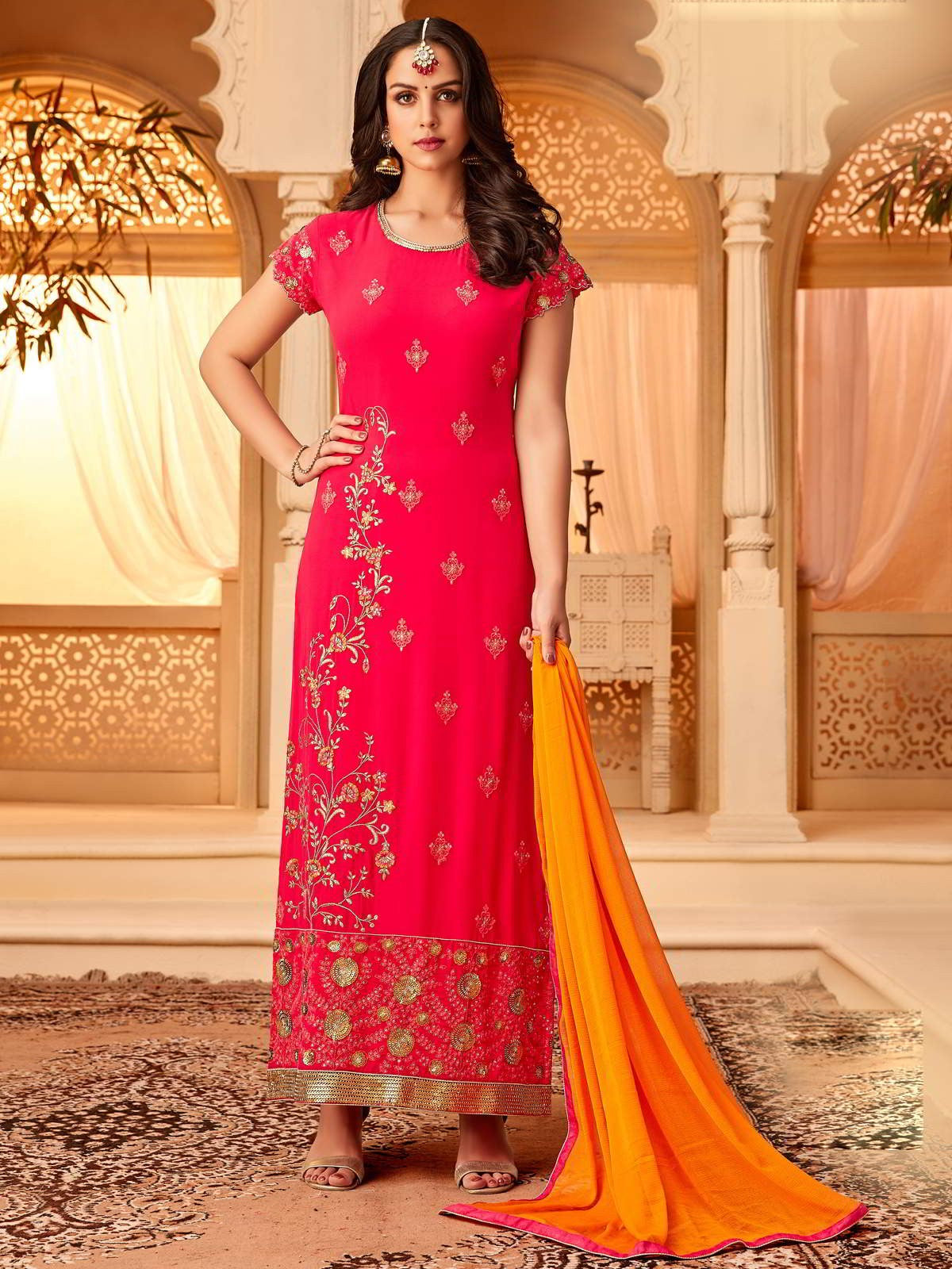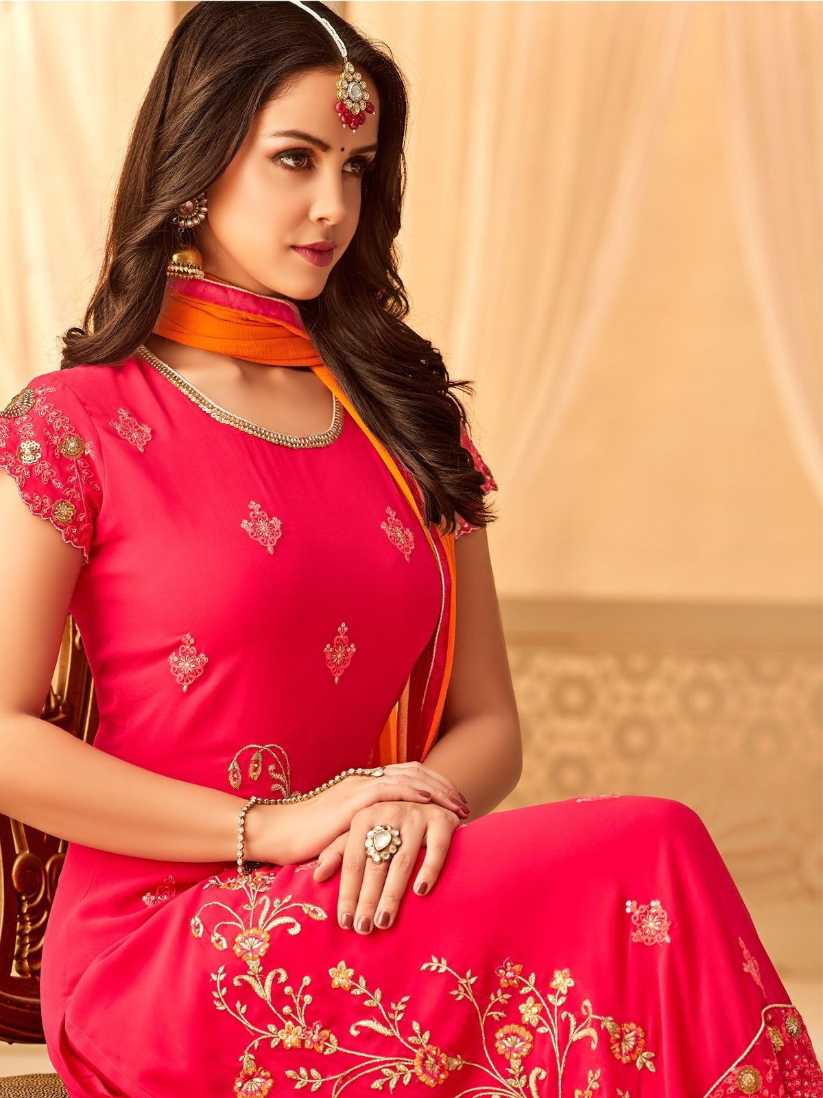 Pink Orange In Combination Embroidered Palazzo Suit will mesmerise rest of the crowd with your ethereal ethnic glow by wearing this set with beautiful top embellished with zari buttis and resham kari embroidery work on georgette fabric with added santoon lining paired with pakistani style palazzo bottom and satin border detailed chiffon dupatta. This set can be teamed up with a pair of golden heels and traditional jhumkas.