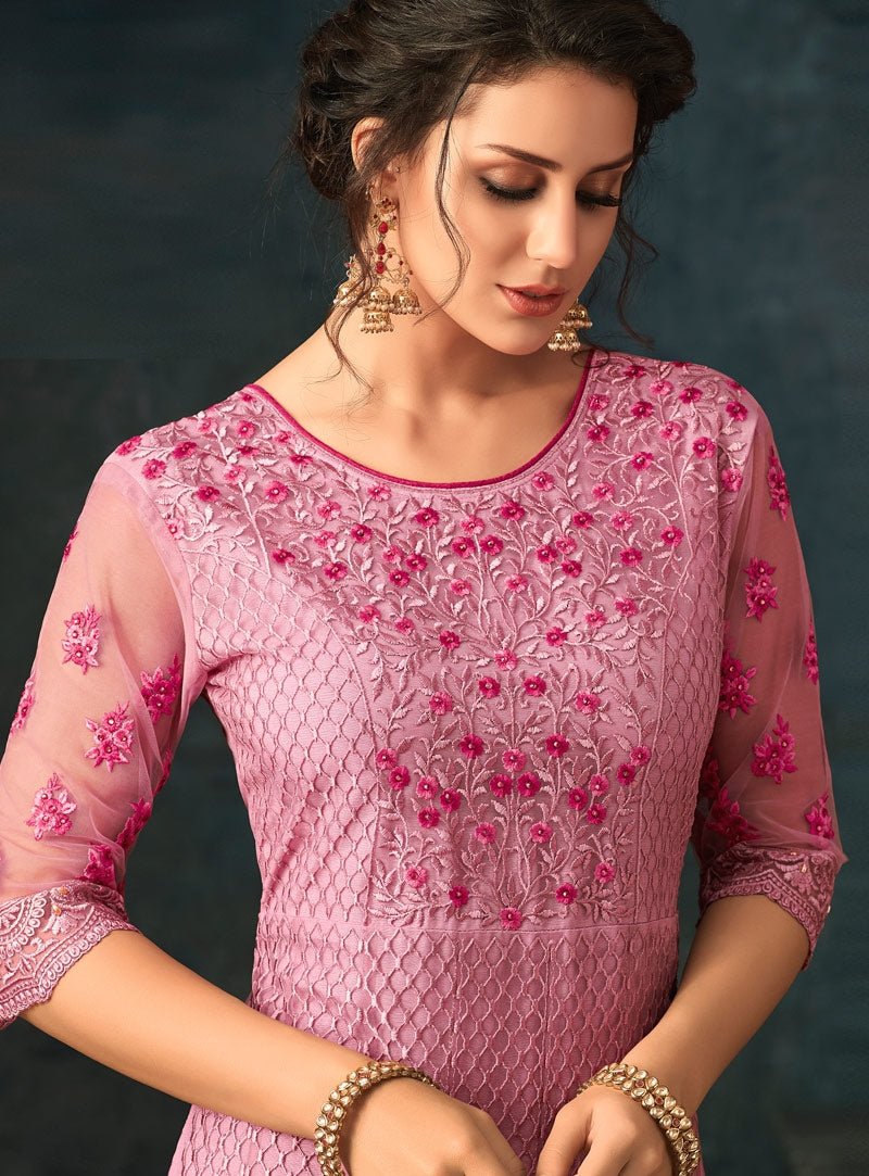 Pink Overall Floral Embroidered Flared Anarkali Suit