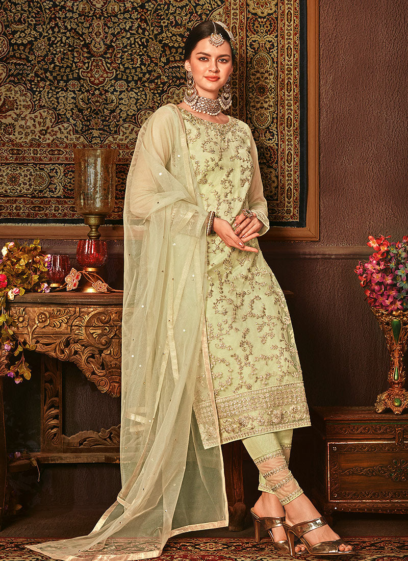 Pista Green Embroidered Pakistani Pants Suit is pakistani style suit with elegant and stylish look to style on wedding events. This set has all the traditional hues of zari, tread and multi embroidery karigiri on its soft net top paired with banarasi silk embroidered pants bottom and inner. The unique part is it’s exclusive satin bordered net dupatta. Wear this with a pair of heels and golden jewellery to have a desi girl look.