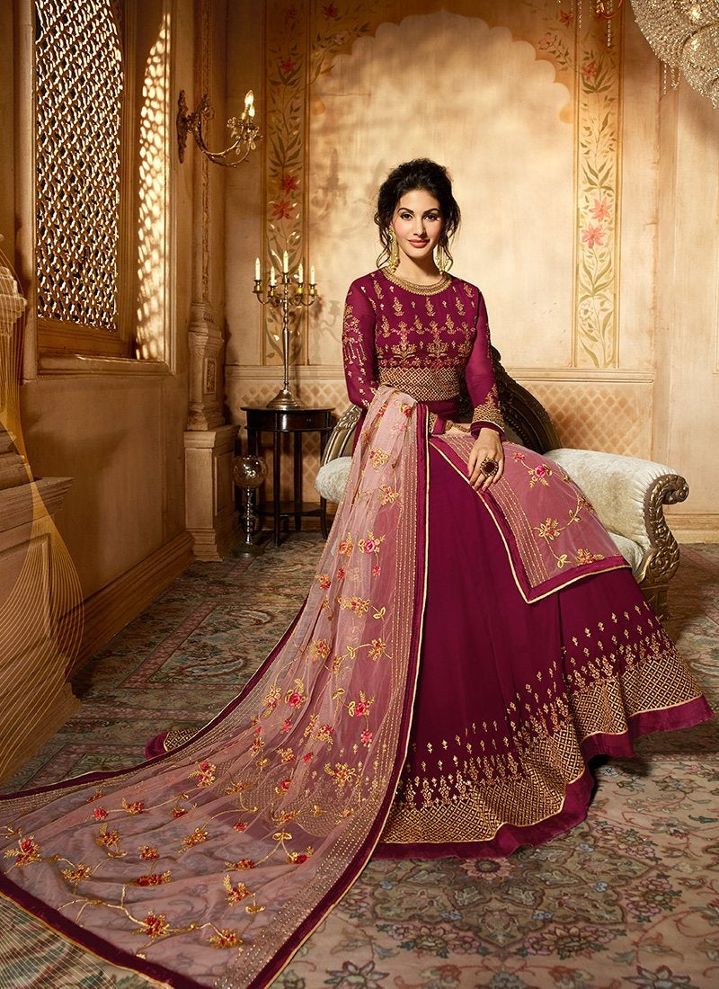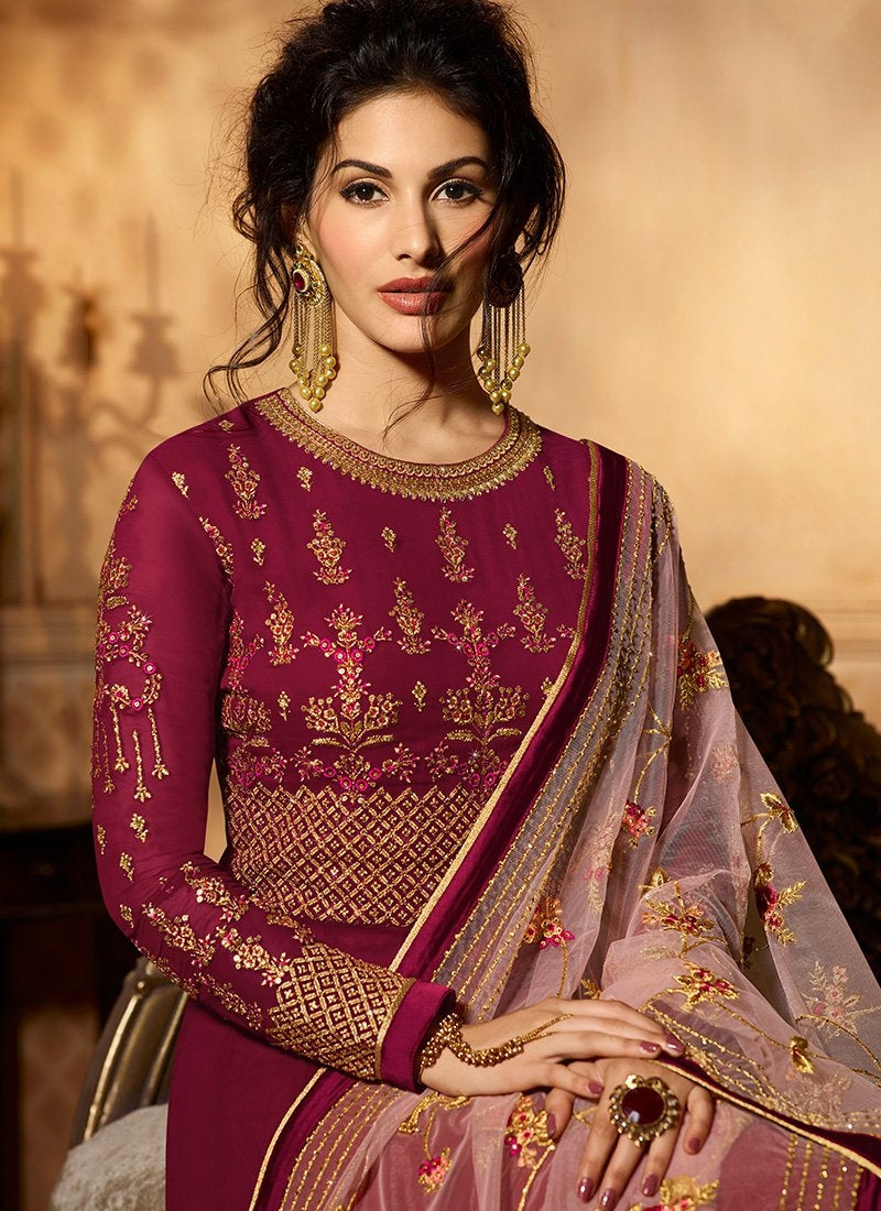 Plum Delicately Embroidered Kalidar Anarkali Suit is specially designed to complement your alluring beauty. This suit set comprises a beautiful traditional zari and thread embroidered designer flared royal georgette top paired with santoon bottom and lining and shimmery net embroidered and embellished dupatta. This suit set will go well with golden jewellery and heels.