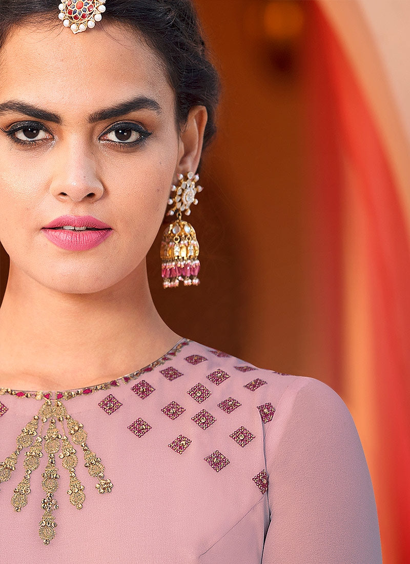 Purple And Wine Embroidered Palazzo Suit features very intrinsic designer embroidery over its georgette top paired with matching layered ghera embroidered georgette palazzo bottom and bordered chiffons dupatta. The dress accompanies with matching heavy santoon lining for top and bottom. Wear this to bright up your wedding parties or any social event with heels and jewellery to look best from rest of the crowd.