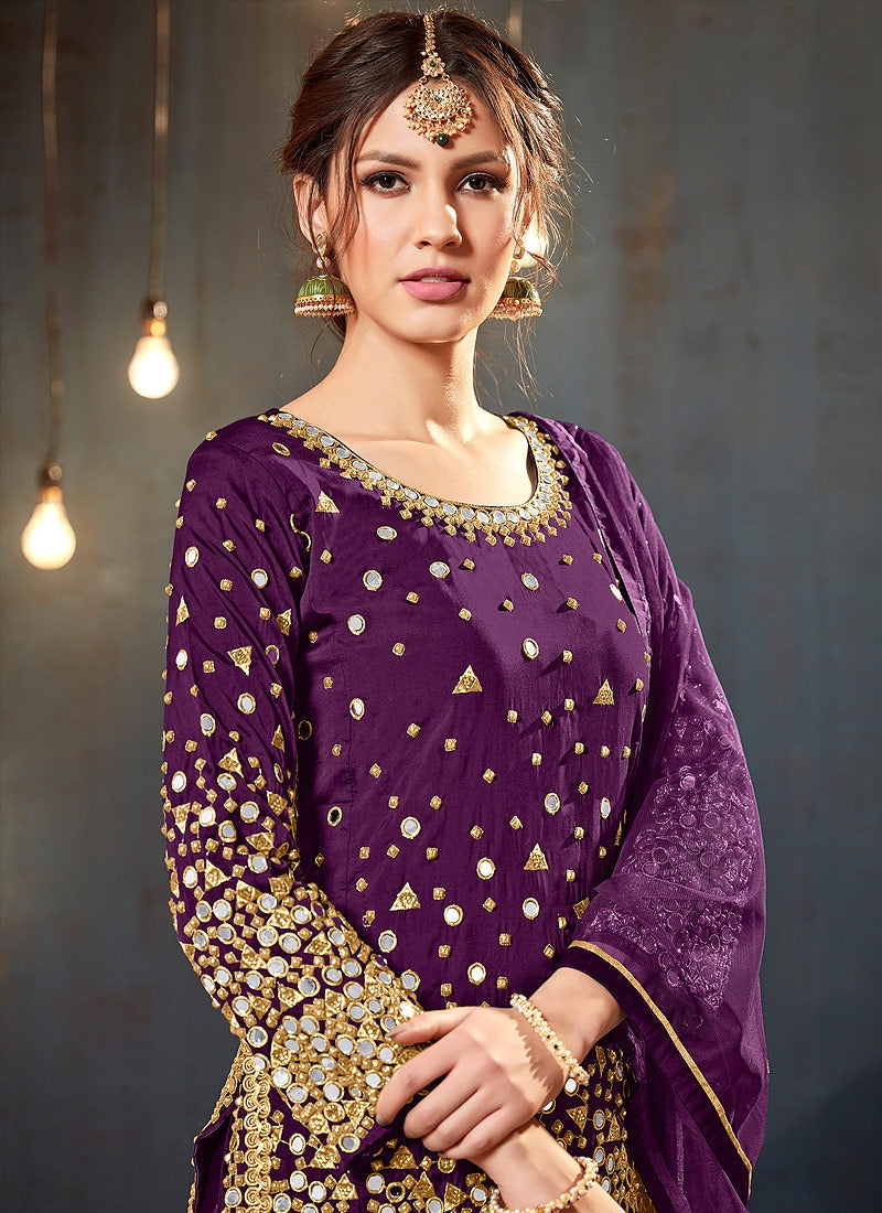 Purple Embroidered Traditional Patiala Suit will mesmerise rest of the crowd with your ethnic glow by wearing this set with top fully embellished with zari buttis and stone work on rangoli silk fabric paired with matching santoon semi patiala bottom and embellished nazmine chiffon dupatta. This set can be teamed up with a pair of golden sandals and traditional jhumkas.