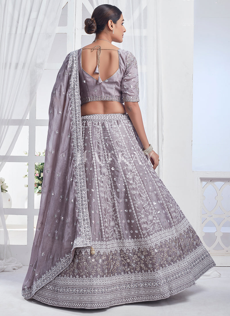 Purple Embroidered Wedding Lehenga Choli is crafted beautifully on premium chiffon silk fabric with all over cording resham thread, golden zari and sequins work detail paired with equally embellished designer premium chiffon silk choli top with satin lining. This set accompanies chiffon dupatta enhanced with heavy all over traditional embroidery detail. Style this gorgeous lehenga with statement jewellery and golden heels to bling on wedding/festive events.