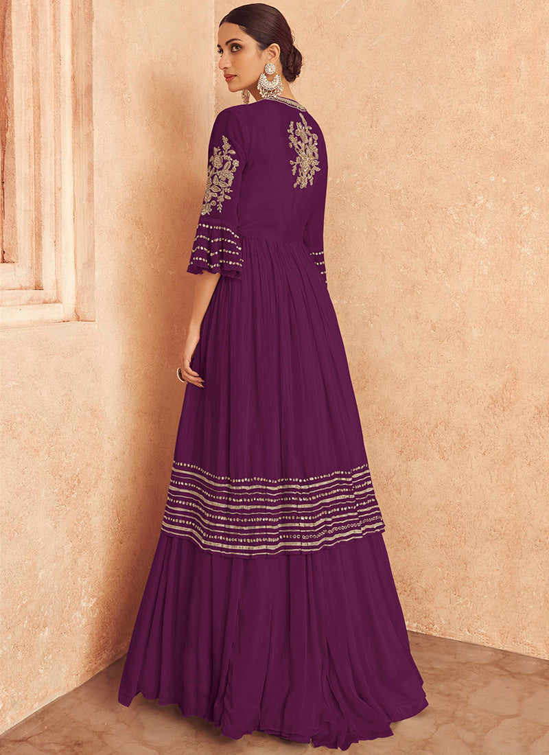 Purple Embroidery Jacket Style Traditional Lehenga Choli features indian attire with traditional embroidery detail annotated beautifully with the combination of golden zari and all over stone work on georgette jacket style top with embellished cropped top paired with pleated georgette lehenga bottom and soft net dupatta. Style this very pretty attire on any wedding or festival party with heels and golden jewellery to look stunningly beautiful from the rest of the crowd.