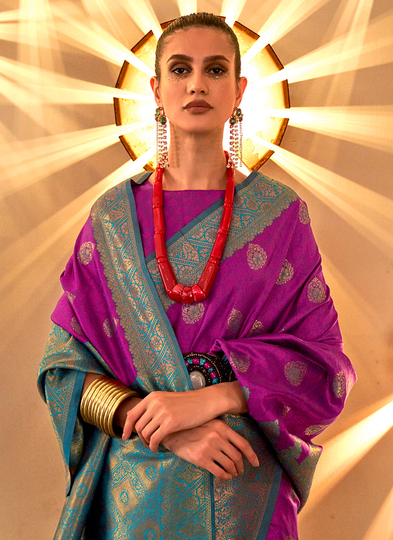 Purple Zari Weaved Handloom Poly Viscose Silk Saree is indian wear showcasing elegance of zari brocade enhanced with multicolored foliate motifs embedded perfectly over pallu and daman on pure handloom poly viscose silk saree with tassel detail paired with viscose silk blouse. Drape this saree on fesitive parties or on wedding events with heels and statement jewellery to look like a diva.