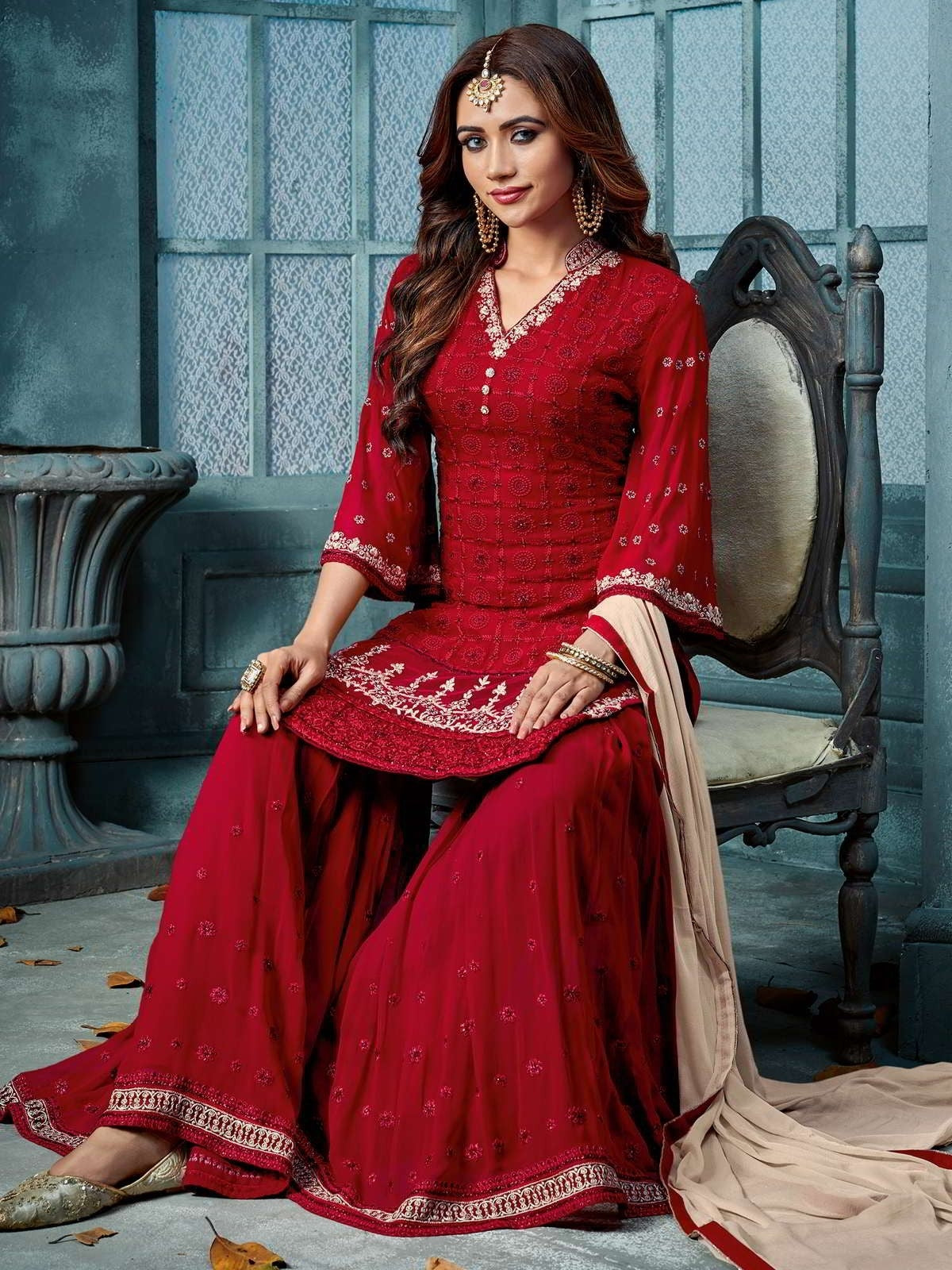 Red And Beige Embroidered Palazzo Suit features very intrinsic designer embroidery over its georgette top paired with contrasting ghera embroidered georgette palazzo bottom and nazmine chiffon dupatta. The dress accompanies with matching santoon lining for top and bottom. Wear this to bright up your wedding parties or any social event with heels and jewellery to look best from rest of the crowd.