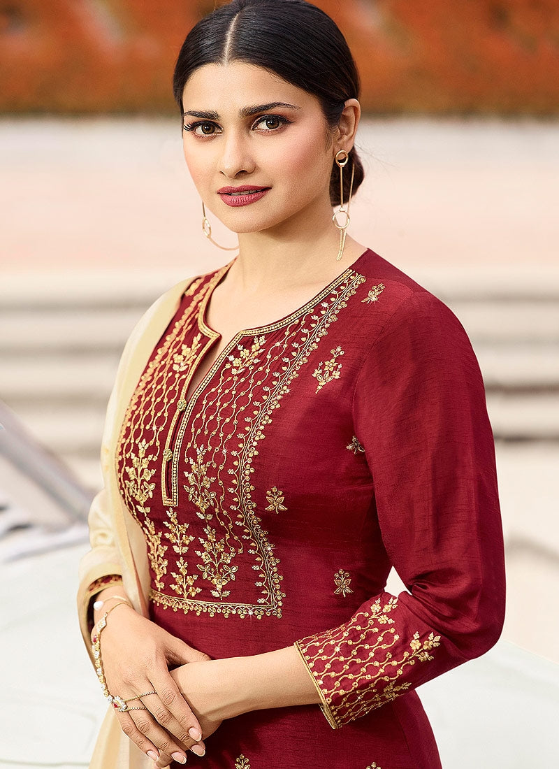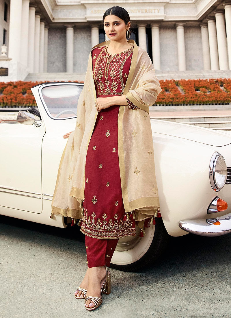 Red And Cream Embroidered Pakistani Pant Suit shows combination of embossed zari and thread detailed embroidery on heavy georgette satin top paired with fancy santoon pants bottom and lining and classic digital golden zari embellished silk dupatta. Alluring beauty of this dress will make you look classy and stylish when styled with stilettos and clutch.