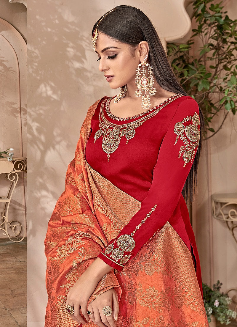 Red And Orange Combination Embroidered Palazzo Suit is specifically designed to make you look perfect for wedding event or any festive occasions. This elegant set comprises a georgette satin kurta with neckline and sleeves detailed with minimal traditional motifs of digital zari and thread embroidery paired with santoon bottom, lining and an extraordinary banarasi jacquard dupatta. Team this suit with golden heels and matching accessories to have a graceful look.