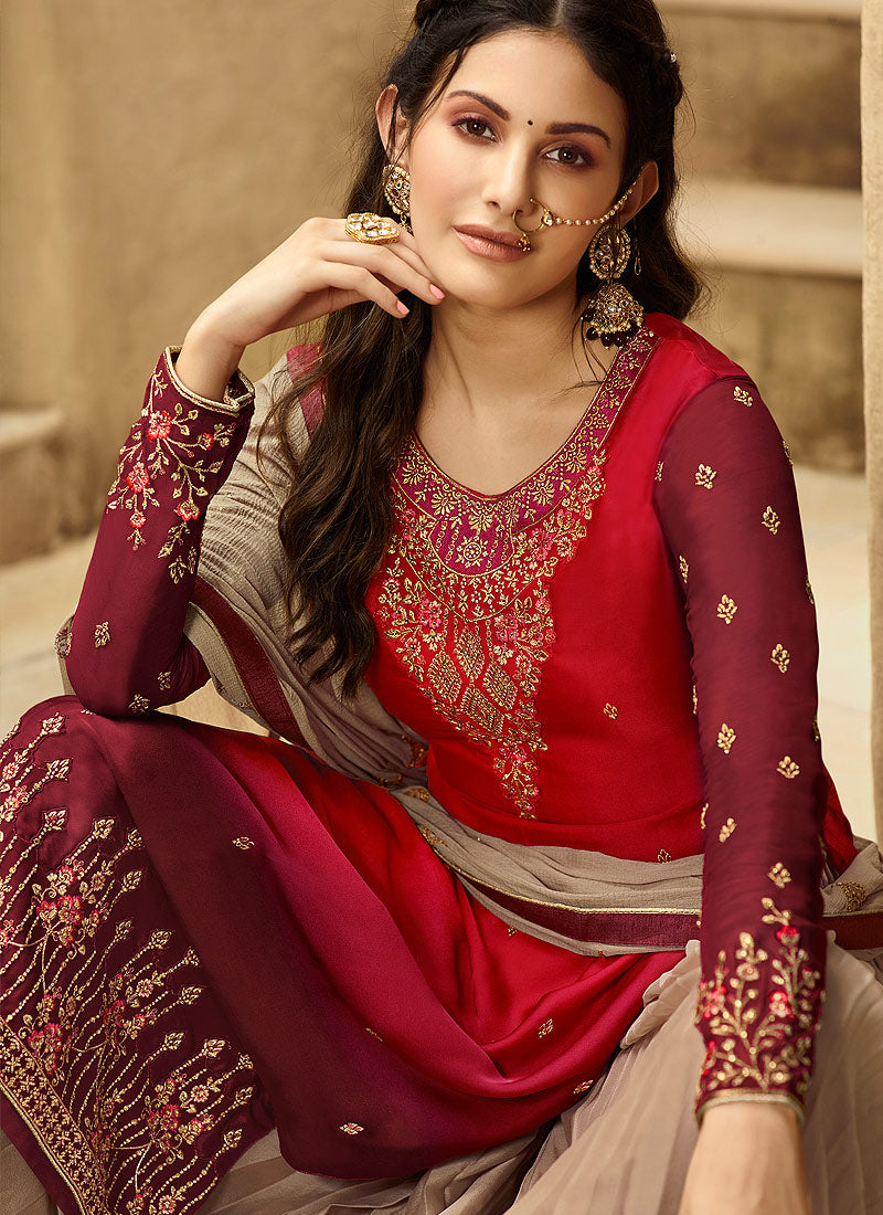 Red Orange And Beige Embroidered Designer Sharara Suit is indian wear Red Orange Sharara Suit suitable to style with all elegance in any desi event. This set has all the ethnic hues of zari, resham thread and stone embroidery work on its satin georgette top paired with embellished georgette gharara bottom and santoon inner. This set accompanies minimalist embroidered chiffon dupatta. Wear this with a pair of heels and golden jewellery to have that desi look.