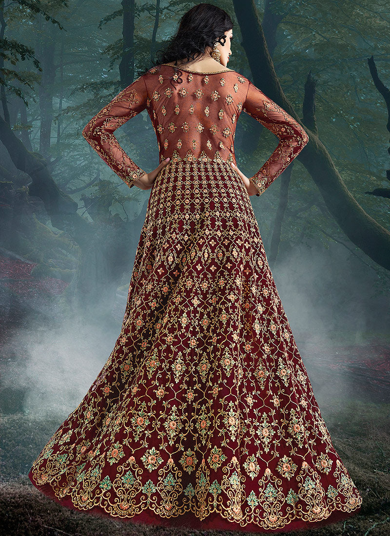 Red Wedding Lehenga Style Anarkali Suit is indian wear especially designed for elegance and glamorous style with its unique embroidered combination of zari, resham and stone work annotated perfectly on round cut net anarkali top with satin lining paired with solid bangalori silk lehenga bottom. This set also accompanies matching satin border and butti enhanced net dupatta. Style it gracefully with golden jewellery and stylish heels.