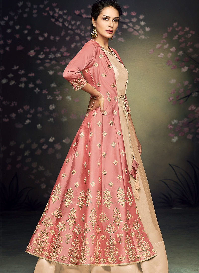 Reddish Rust Butti Embroidered Jacket Style Anarkali Suit is especially crafted for showcasing glamorous style and ethnic elegance with its unique embroidered combination of zari, thread and reshamkari embroidered on satin silk jacket and soft net floor length anarkali gown that can be styled on cocktail parties as well as on wedding event paired with bordered pure chiffon dupatta. Team this set with fancy stilettos and statement jewellery to glam up your evening.